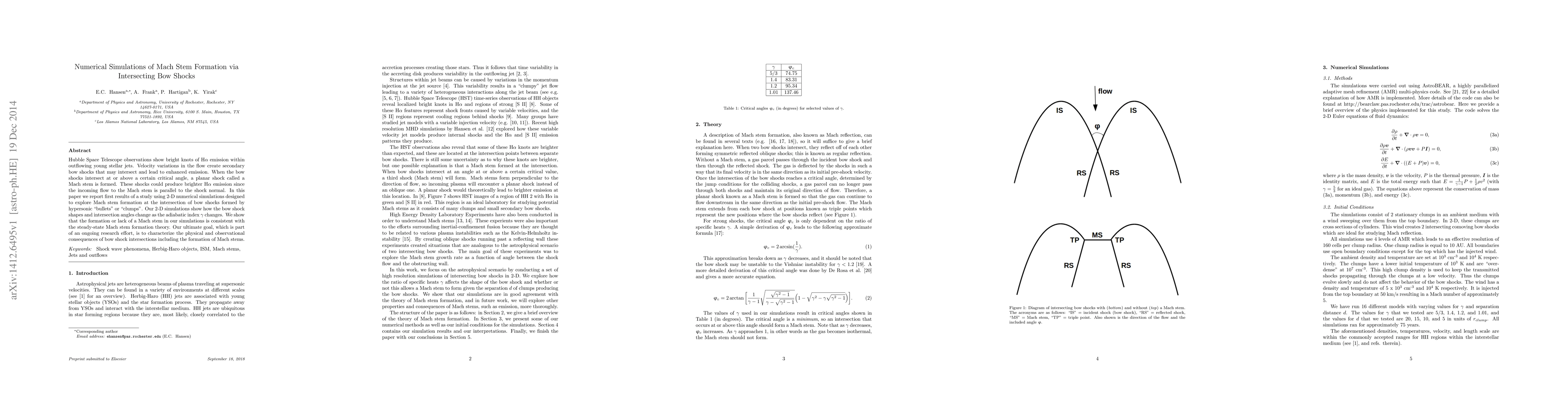 Hubble Space Telescope observations show bright knots of H$\alpha$ emission within outflowing young stellar jets. Velocity variations in the flow create secondary bow shocks that may intersect and lead to enhanced emission. When the bow shocks intersect at or above a certain critical angle, a planar shock called a Mach stem is formed. These shocks could produce brighter H$\alpha$ emission since the incoming flow to the Mach stem is parallel to the shock normal. In this paper we report first results of a study using 2-D numerical simulations designed to explore Mach stem formation at the intersection of bow shocks formed by hypersonic "bullets" or "clumps". Our 2-D simulations show how the bow shock shapes and intersection angles change as the adiabatic index $\gamma$ changes. We show that the formation or lack of a Mach stem in our simulations is consistent with the steady-state Mach stem formation theory. Our ultimate goal, which is part of an ongoing research effort, is to characterize the physical and observational consequences of bow shock intersections including the formation of Mach stems.