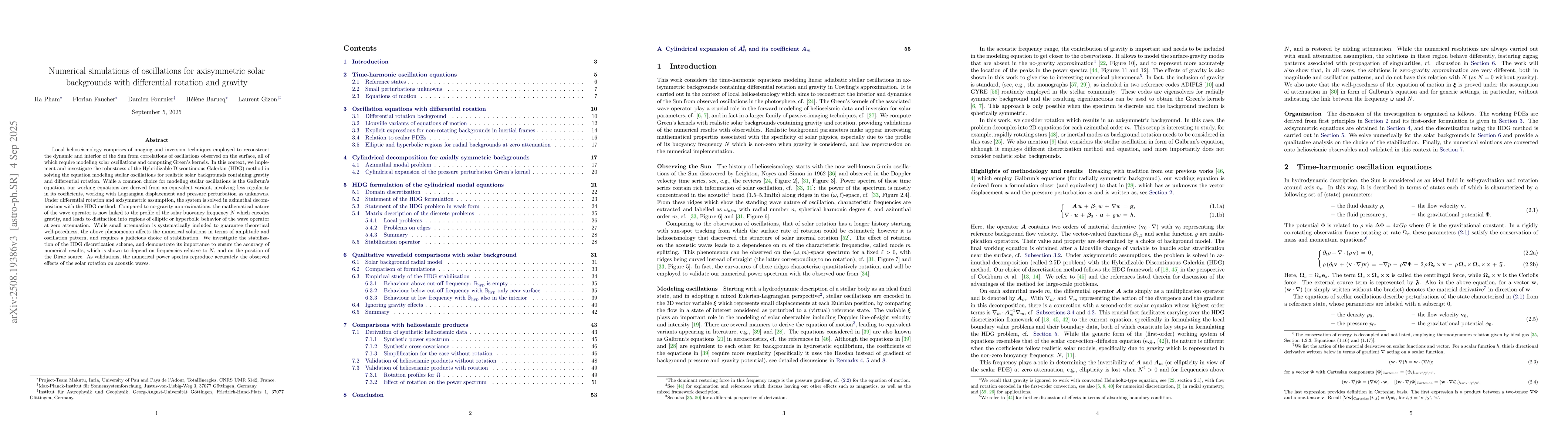 Local helioseismology comprises of imaging and inversion techniques employed to reconstruct the dynamic and interior of the Sun from correlations of oscillations observed on the surface, all of which require modeling solar oscillations and computing Green's kernels. In this context, we implement and investigate the robustness of the Hybridizable Discontinuous Galerkin (HDG) method in solving the equation modeling stellar oscillations for realistic solar backgrounds containing gravity and differential rotation. While a common choice for modeling stellar oscillations is the Galbrun's equation, our working equations are derived from an equivalent variant, involving less regularity in its coefficients, working with Lagrangian displacement and pressure perturbation as unknowns. Under differential rotation and axisymmetric assumption, the system is solved in azimuthal decomposition with the HDG method. Compared to no-gravity approximations, the mathematical nature of the wave operator is now linked to the profile of the solar buoyancy frequency N which encodes gravity, and leads to distinction into regions of elliptic or hyperbolic behavior of the wave operator at zero attenuation. While small attenuation is systematically included to guarantee theoretical well-posedness, the above phenomenon affects the numerical solutions in terms of amplitude and oscillation pattern, and requires a judicious choice of stabilization. We investigate the stabilization of the HDG discretization scheme, and demonstrate its importance to ensure the accuracy of numerical results, which is shown to depend on frequencies relative to N, and on the position of the Dirac source. As validations, the numerical power spectra reproduce accurately the observed effects of the solar rotation on acoustic waves.