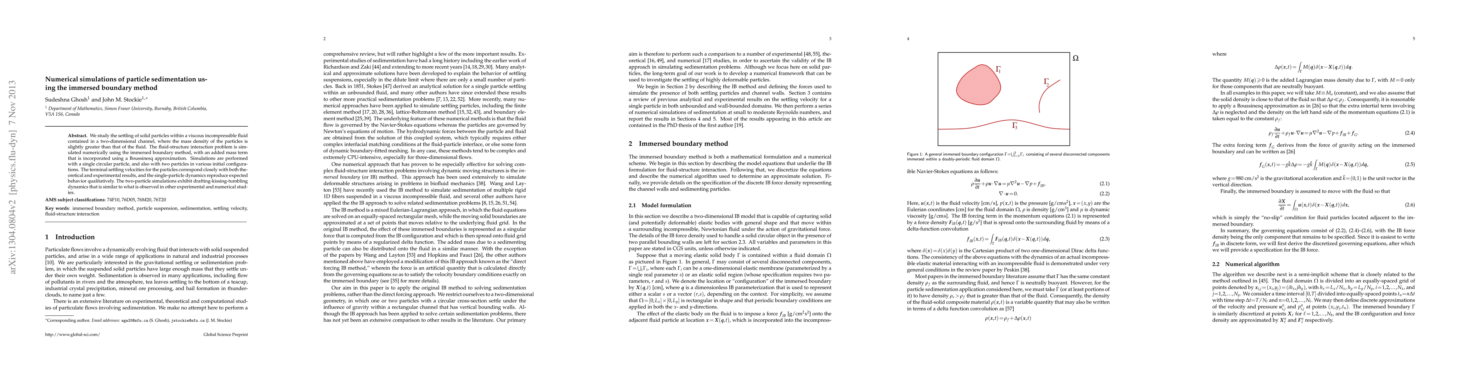 This paper uses the immersed boundary method to numerically simulate particle sedimentation in a viscous fluid, showing good agreement with theoretical and experimental results. It examines both single and two-particle interactions, revealing drafting-kissing-tumbling dynamics in the latter.