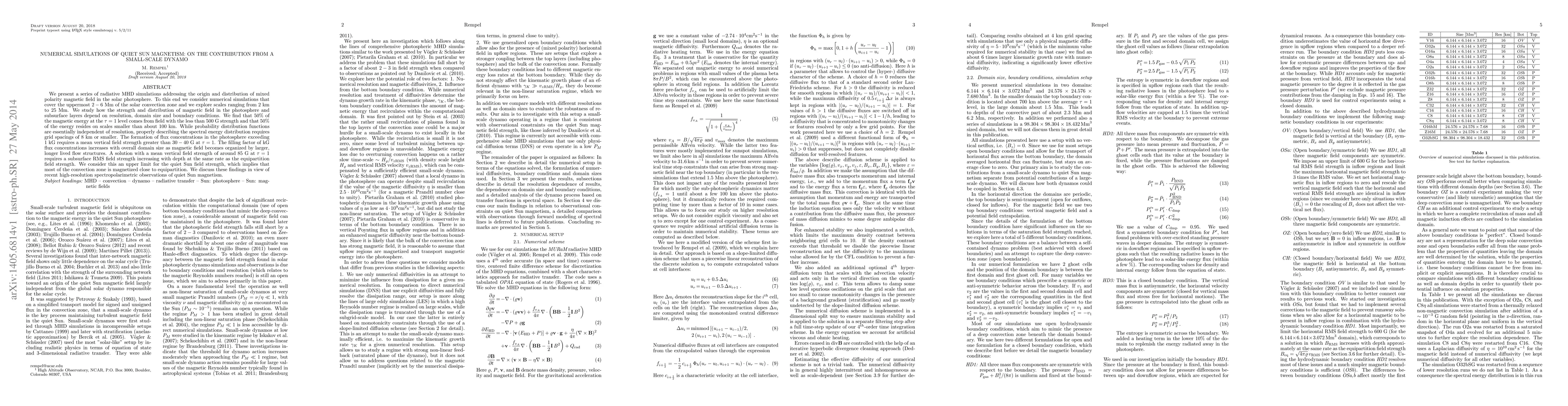 We present a series of radiative MHD simulations addressing the origin and distribution of mixed polarity magnetic field in the solar photosphere. To this end we consider numerical simulations that cover the uppermost 2-6 Mm of the solar convection zone and we explore scales ranging from 2 km to 25 Mm. We study how the strength and distribution of magnetic field in the photosphere and subsurface layers depend on resolution, domain size and boundary conditions. We find that 50% of the magnetic energy at the \tau=1 level comes from field with the less than 500 G strength and that 50% of the energy resides on scales smaller than about 100 km. While probability distribution functions are essentially independent of resolution, properly describing the spectral energy distribution requires grid spacings of 8 km or smaller. The formation of flux concentrations in the photosphere exceeding 1 kG requires a mean vertical field strength greater than 30-40 G at \tau=1. The filling factor of kG flux concentrations increases with overall domain size as magnetic field becomes organized by larger, longer lived flow structures. A solution with a mean vertical field strength of around 85 G at \tau=1 requires a subsurface RMS field strength increasing with depth at the same rate as the equipartition field strength. We consider this an upper limit for the quiet Sun field strength, which implies that most of the convection zone is magnetized close to equipartition. We discuss these findings in view of recent high-resolution spectropolarimetric observations of quiet Sun magnetism.