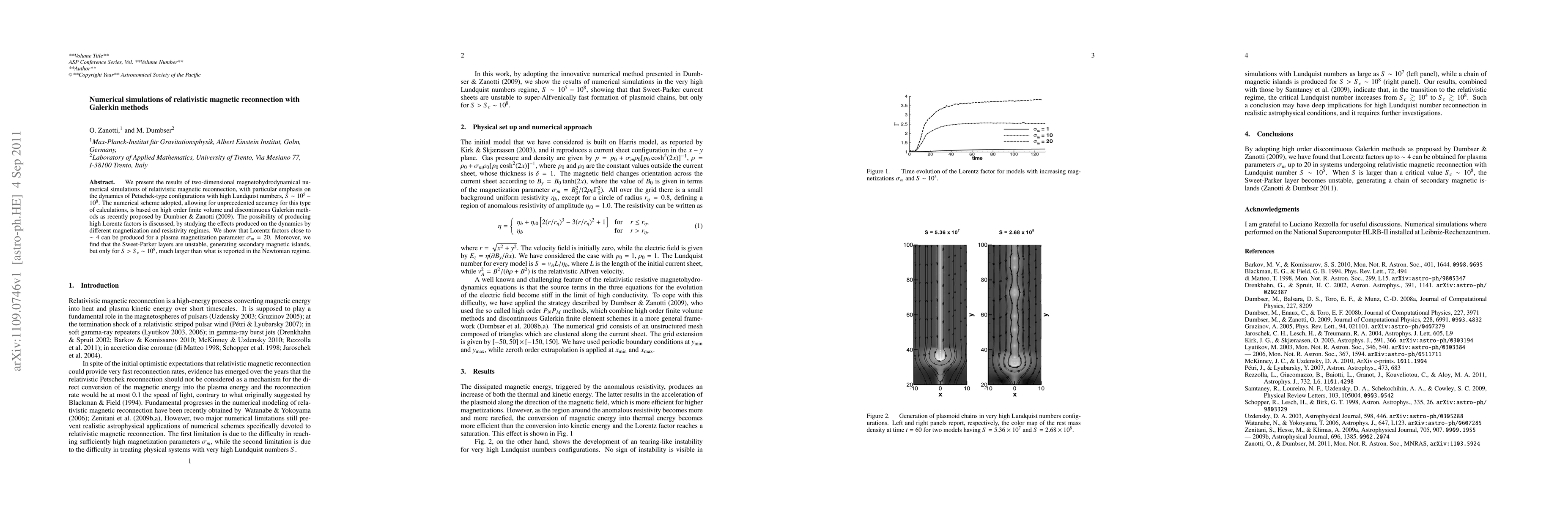 This paper presents high-accuracy simulations of relativistic magnetic reconnection using Galerkin methods, focusing on Petschek-type dynamics at high Lundquist numbers. The study shows that Lorentz factors up to ~4 can be achieved with a plasma magnetization parameter of sigma=20, and reveals that Sweet-Parker layers become unstable and generate secondary islands only at S>S_c~10^8.