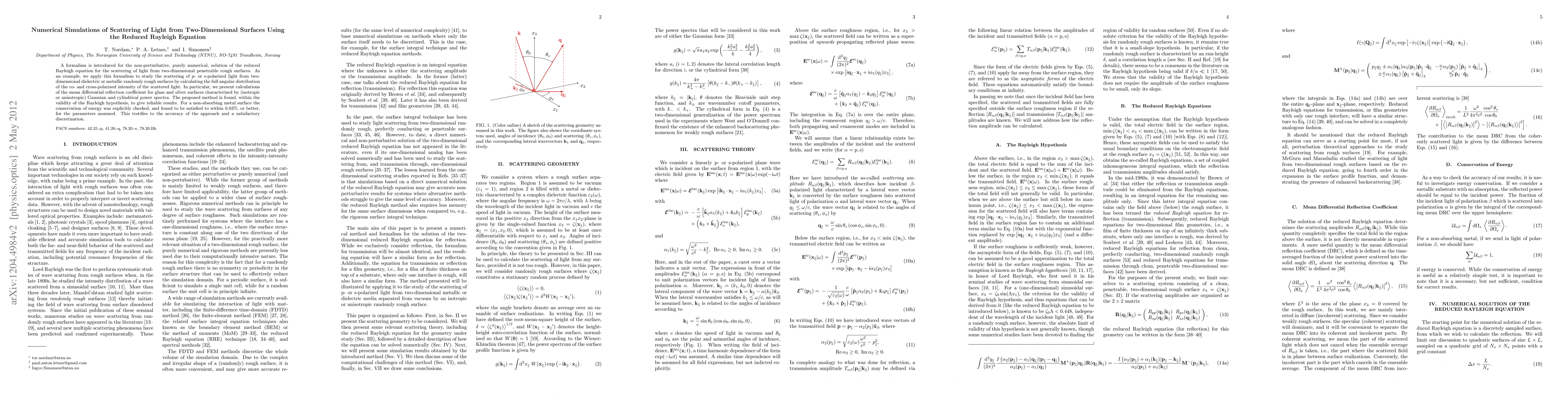 This paper introduces a numerical method for solving the reduced Rayleigh equation to simulate light scattering from two-dimensional rough surfaces. It applies the method to calculate the angular distribution of scattered light and validates the approach by checking energy conservation for metallic surfaces, achieving accuracy within 0.03%.