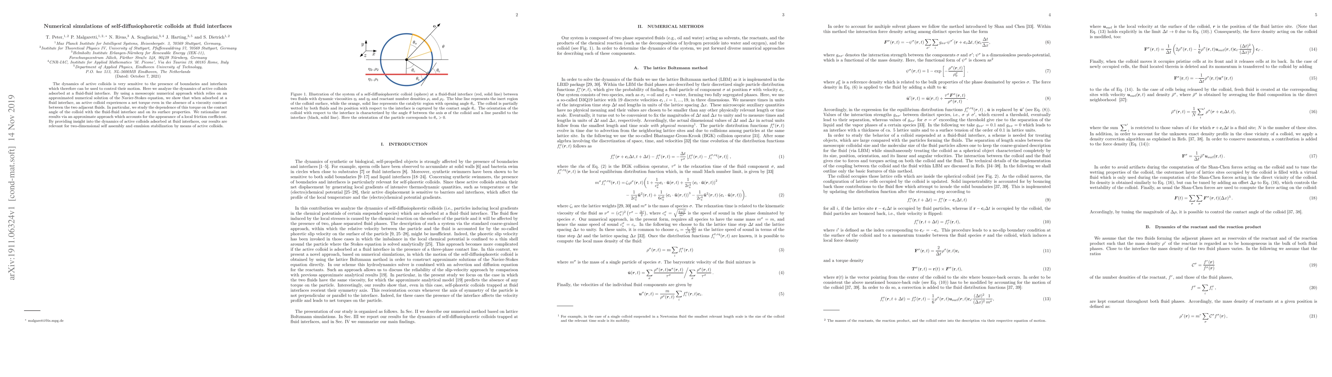 This paper investigates the dynamics of self-diffusiophoretic colloids at fluid interfaces using a mesoscopic numerical approach. It reveals that active colloids experience a net torque at interfaces, even without viscosity contrast, and analyzes the influence of contact angle and surface properties on this torque.