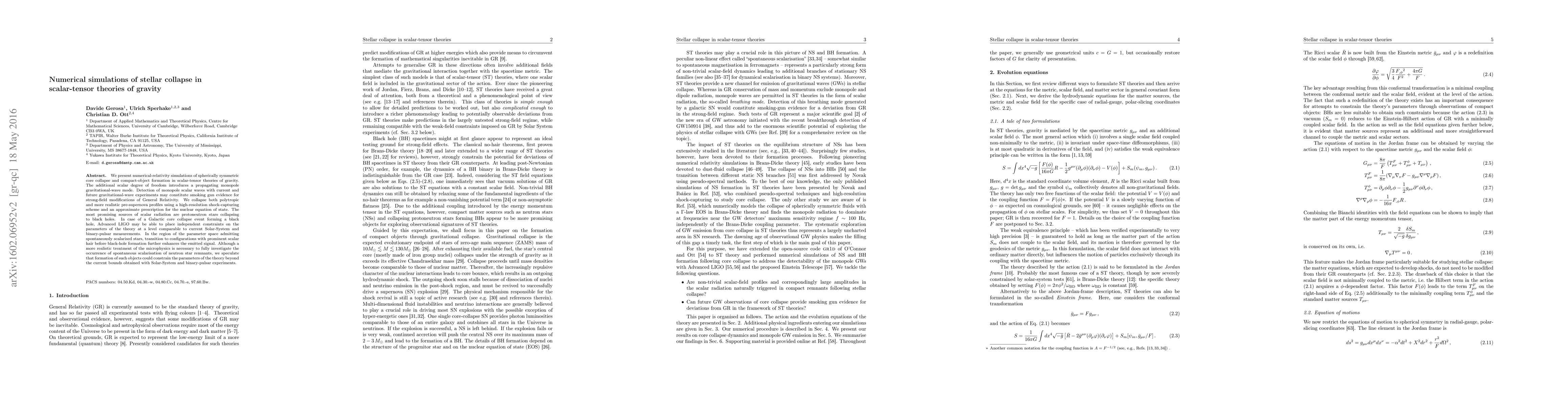 We present numerical-relativity simulations of spherically symmetric core collapse and compact-object formation in scalar-tensor theories of gravity. The additional scalar degree of freedom introduces a propagating monopole gravitational-wave mode. Detection of monopole scalar waves with current and future gravitational-wave experiments may constitute smoking gun evidence for strong-field modifications of General Relativity. We collapse both polytropic and more realistic pre-supernova profiles using a high-resolution shock-capturing scheme and an approximate prescription for the nuclear equation of state. The most promising sources of scalar radiation are protoneutron stars collapsing to black holes. In case of a Galactic core collapse event forming a black hole, Advanced LIGO may be able to place independent constraints on the parameters of the theory at a level comparable to current Solar-System and binary-pulsar measurements. In the region of the parameter space admitting spontaneously scalarised stars, transition to configurations with prominent scalar hair before black-hole formation further enhances the emitted signal. Although a more realistic treatment of the microphysics is necessary to fully investigate the occurrence of spontaneous scalarisation of neutron star remnants, we speculate that formation of such objects could constrain the parameters of the theory beyond the current bounds obtained with Solar-System and binary-pulsar experiments.