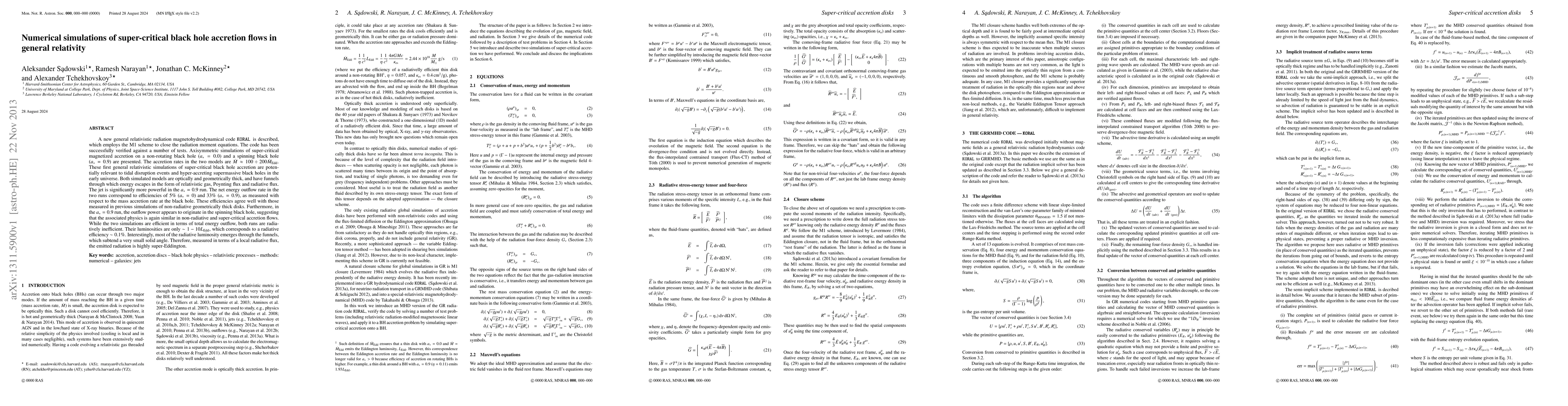 A new general relativistic radiation magnetohydrodynamical code KORAL, is described, which employs the M1 scheme to close the radiation moment equations. The code has been successfully verified against a number of tests. Axisymmetric simulations of super-critical magnetized accretion on a non-rotating black hole (a=0.0) and a spinning black hole (a=0.9) are presented. The accretion rates in the two models are \dot M = 100-200 \dot M_Edd. These first general relativistic simulations of super-critical black hole accretion are potentially relevant to tidal disruption events and hyper-accreting supermassive black holes in the early universe. Both simulated models are optically and geometrically thick, and have funnels through which energy escapes in the form of relativistic gas, Poynting flux and radiative flux. The jet is significantly more powerful in the a=0.9 run. The net energy outflow rate in the two runs correspond to efficiencies of 5% (a=0) and 33% (a=0.9), as measured with respect to the mass accretion rate at the black hole. These efficiencies agree well with those measured in previous simulations of non-radiative geometrically thick disks. Furthermore, in the a=0.9 run, the outflow power appears to originate in the spinning black hole, suggesting that the associated physics is again similar in non-radiative and super-critical accretion flows. While the two simulations are efficient in terms of total energy outflow, both runs are radiatively inefficient. Their luminosities are only \sim 1-10 L_Edd, which corresponds to a radiative efficiency \sim 0.1%. Interestingly, most of the radiative luminosity emerges through the funnels, which subtend a very small solid angle. Therefore, measured in terms of a local radiative flux, the emitted radiation is highly super-Eddington.