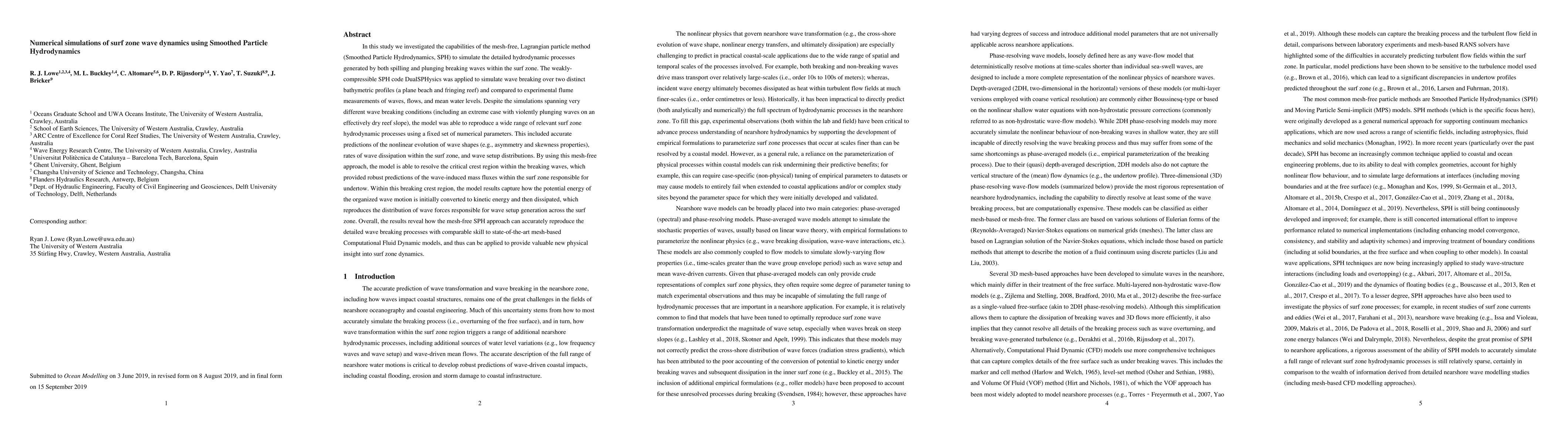 This work stands out by applying SPH, a mesh-free method, to surf zone dynamics, demonstrating its ability to accurately capture detailed hydrodynamic processes, including wave breaking and undertow generation, which traditionally have been challenging with mesh-based models.