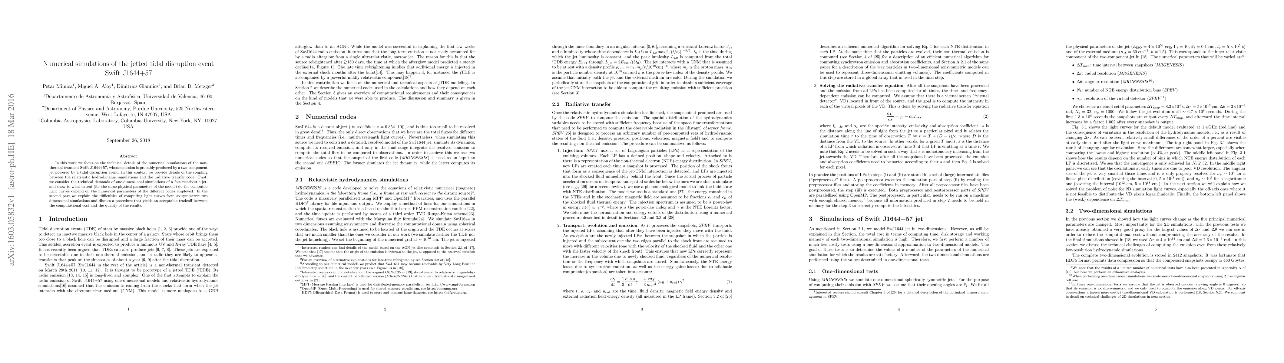 In this work we focus on the technical details of the numerical simulations of the non- thermal transient Swift J1644+57, whose emission is probably produced by a two-component jet powered by a tidal disruption event. In this context we provide details of the coupling between the relativistic hydrodynamic simulations and the radiative transfer code. First, we consider the technical demands of one-dimensional simulations of a fast relativistic jet, and show to what extent (for the same physical parameters of the model) do the computed light curves depend on the numerical parameters of the different codes employed. In the second part we explain the difficulties of computing light curves from axisymmetric two dimensonal simulations and discuss a procedure that yields an acceptable tradeoff between the computational cost and the quality of the results.