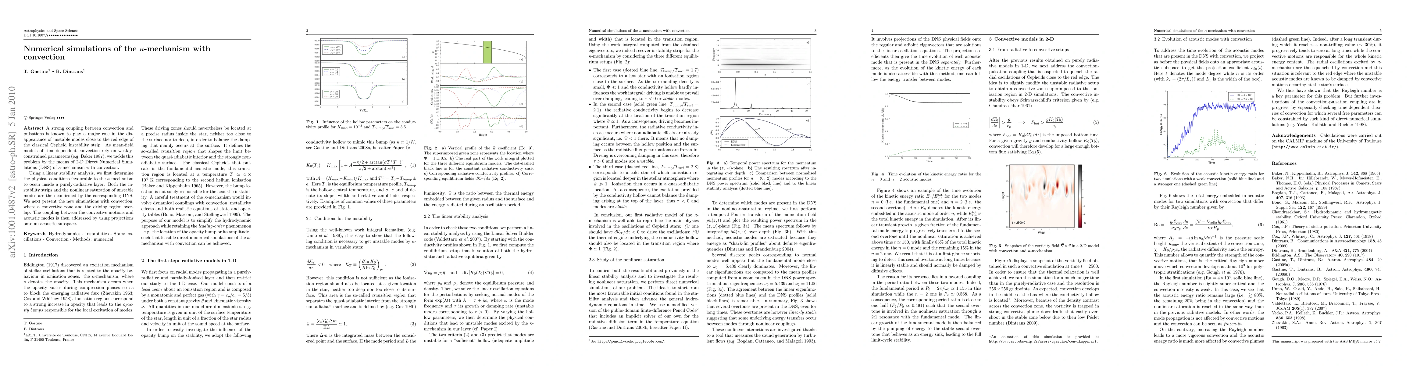 A strong coupling between convection and pulsations is known to play a major role in the disappearance of unstable modes close to the red edge of the classical Cepheid instability strip. As mean-field models of time-dependent convection rely on weakly-constrained parameters, we tackle this problem by the means of 2-D Direct Numerical Simulations (DNS) of kappa-mechanism with convection. Using a linear stability analysis, we first determine the physical conditions favourable to the kappa-mechanism to occur inside a purely-radiative layer. Both the instability strips and the nonlinear saturation of unstable modes are then confirmed by the corresponding DNS. We next present the new simulations with convection, where a convective zone and the driving region overlap. The coupling between the convective motions and acoustic modes is then addressed by using projections onto an acoustic subspace.