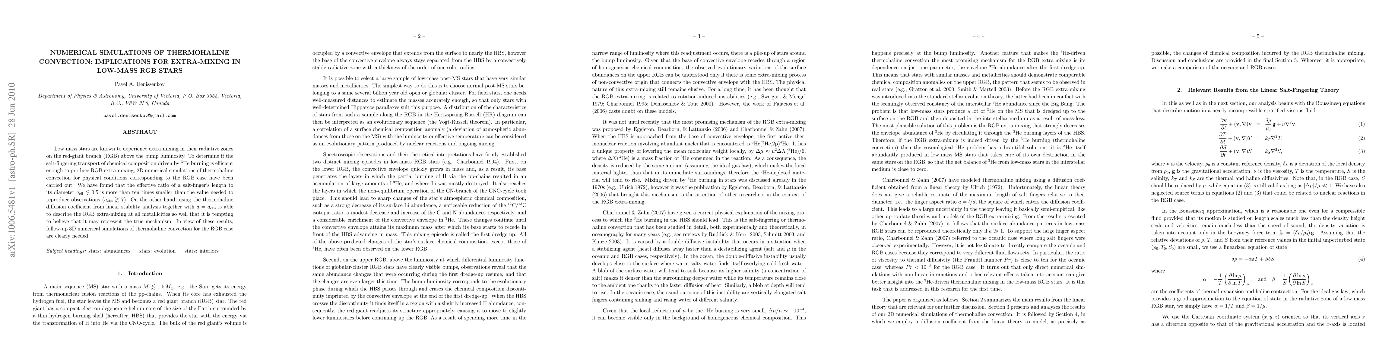 This paper investigates the efficiency of salt-fingering in low-mass red-giant branch stars through 2D numerical simulations of thermohaline convection. The study finds that salt-fingering is insufficient for observed extra-mixing, but thermohaline diffusion may represent the true mechanism, prompting the need for 3D simulations.