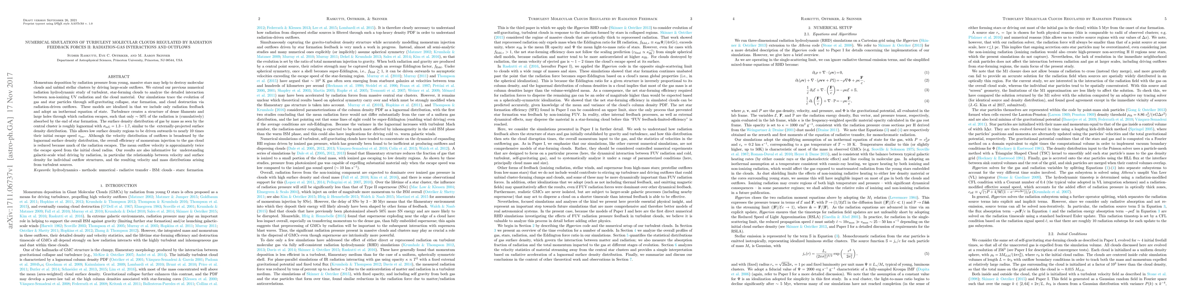 This paper investigates the impact of radiation pressure from massive stars on turbulent molecular clouds, focusing on the interaction between non-ionizing UV radiation and cloud material. The simulations reveal that radiation-driven outflows are effective in destroying clouds, despite only about 50% of the radiation being absorbed, leading to outflows with velocities nearly twice the initial escape speed.
