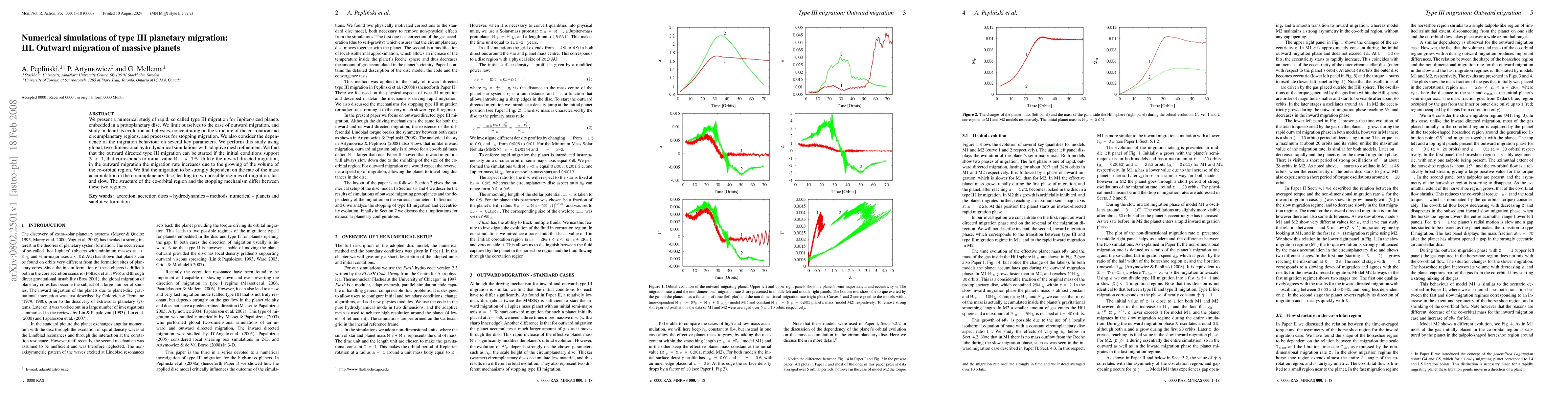 We present a numerical study of rapid, so called type III migration for Jupiter-sized planets embedded in a protoplanetary disc. We limit ourselves to the case of outward migration, and study in detail its evolution and physics, concentrating on the structure of the co-rotation and circumplanetary regions, and processes for stopping migration. We also consider the dependence of the migration behaviour on several key parameters. We perform this study using global, two-dimensional hydrodynamical simulations with adaptive mesh refinement. We find that the outward directed type III migration can be started if the initial conditions support $Z > 1$, that corresponds to initial value $M_\rmn{\Delta} \ga 1.5$. Unlike the inward directed migration, in the outward migration the migration rate increases due to the growing of the volume of the co-orbital region. We find the migration to be strongly dependent on the rate of the mass accumulation in the circumplanetary disc, leading to two possible regimes of migration, fast and slow. The structure of the co-orbital region and the stopping mechanism differ between these two regimes.