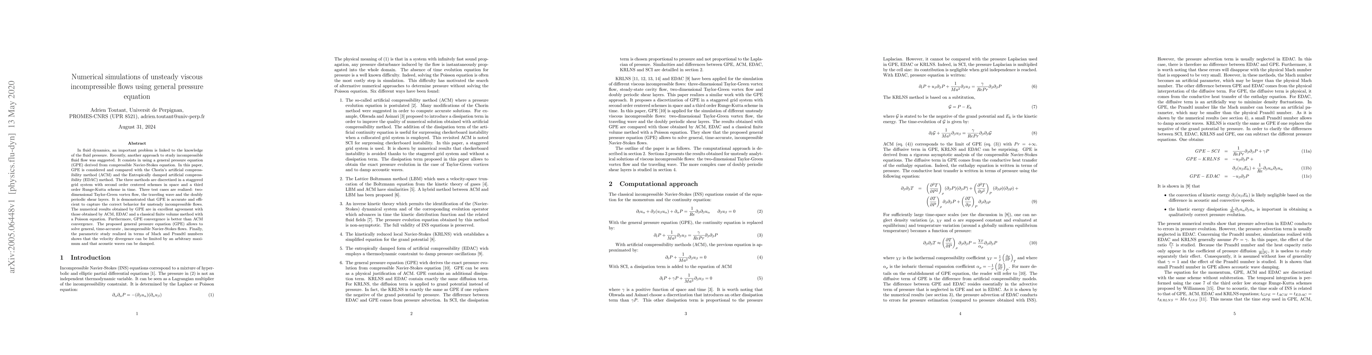 In fluid dynamics, an important problem is linked to the knowledge of the fluid pressure. Recently, another approach to study incompressible fluid flow was suggested. It consists in using a general pressure equation (GPE) derived from compressible Navier-Stokes equation. In this paper, GPE is considered and compared with the Chorin's artificial compressibility method (ACM) and the Entropically damped artificial compressibility (EDAC) method. The three methods are discretized in a staggered grid system with second order centered schemes in space and a third order Runge-Kutta scheme in time. Three test cases are realized: two-dimensional Taylor-Green vortex flow, the traveling wave and the doubly periodic shear layers. It is demonstrated that GPE is accurate and efficient to capture the correct behavior for unsteady incompressible flows. The numerical results obtained by GPE are in excellent agreement with those obtained by ACM, EDAC and a classical finite volume method with a Poisson equation. Furthermore, GPE convergence is better than ACM convergence. The proposed general pressure equation (GPE) allows to solve general, time-accurate , incompressible Navier-Stokes flows. Finally, the parametric study realized in terms of Mach and Prandtl numbers shows that the velocity divergence can be limited by an arbitrary maximum and that acoustic waves can be damped.