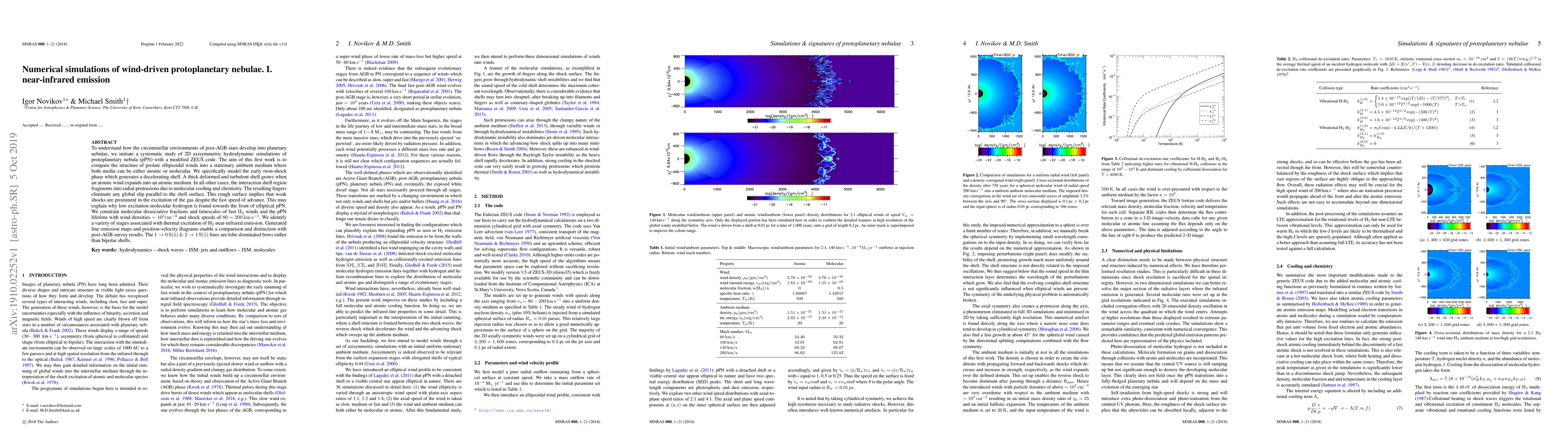 To understand how the circumstellar environments of post-AGB stars develop into planetary nebulae, we initiate a systematic study of 2D axisymmetric hydrodynamic simulations of protoplanetary nebula (pPN) with a modified ZEUS code. The aim of this first work is to compare the structure of prolate ellipsoidal winds into a stationary ambient medium where both media can be either atomic or molecular. We specifically model the early twin-shock phase which generates a decelerating shell. A thick deformed and turbulent shell grows when an atomic wind expands into an atomic medium. In all other cases, the interaction shell region fragments into radial protrusions due to molecular cooling and chemistry. The resulting fingers eliminate any global slip parallel to the shell surface. This rough surface implies that weak shocks are prominent in the excitation of the gas despite the fast speed of advance. This may explain why low excitation molecular hydrogen is found towards the front of elliptical pPN. We constrain molecular dissociative fractions and timescales of fast $\mathrm H_2$ winds and the pPN lifetime with wind densities $\mathrm{\sim10^{5}cm^{-3}}$ and shock speeds of $\mathrm{80\sim200\,km\,s^{-1}}$. We identify a variety of stages associated with thermal excitation of H$_2$ near-infrared emission. Generated line emission maps and position-velocity diagrams enable a comparison and distinction with post-AGB survey results. The $\mathrm{1\to0 \, S(1)}$ $\&$ $\mathrm{2\to1 \, S(1)}$ lines are lobe-dominated bows rather than bipolar shells.