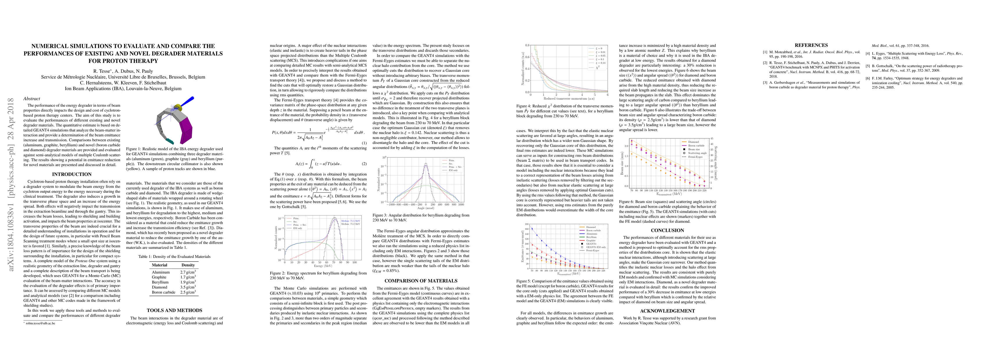 The performance of the energy degrader in terms of beam properties directly impacts the design and cost of cyclotron-based proton therapy centers. The aim of this study is to evaluate the performances of different existing and novel degrader materials. The quantitative estimate is based on detailed GEANT4 simulations that analyze the beam-matter interaction and provide a determination of the beam emittance increase and transmission. Comparisons between existing (aluminum, graphite, beryllium) and novel (boron carbide and diamond) degrader materials are provided and evaluated against semi-analytical models of multiple Coulomb scattering. The results showing a potential in emittance reduction for novel materials are presented and discussed in detail.