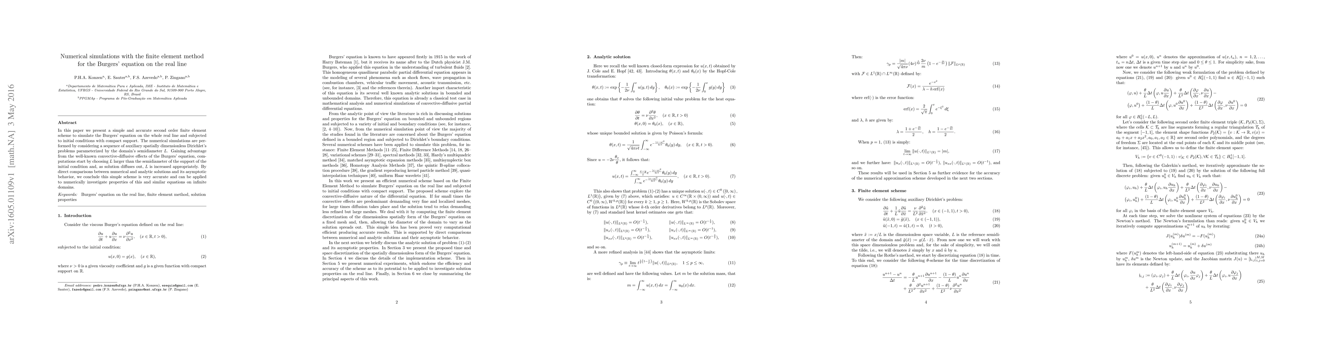 In this paper we present a simple and accurate second order finite element scheme to simulate the Burgers' equation on the whole real line and subjected to initial conditions with compact support. The numerical simulations are performed by considering a sequence of auxiliary spatially dimensionless Dirichlet's problems parameterized by the domain's semidiameter L. Gaining advantage from the well-known convective-diffusive effects of the Burgers' equation, computations start by choosing L larger than the semidiameter of the support of the initial condition and, as solution diffuses out, L is increased appropriately. By direct comparisons between numerical and analytic solutions and its asymptotic behavior, we conclude this simple scheme is very accurate and can be applied to numerically investigate properties of this and similar equations on infinite domains.