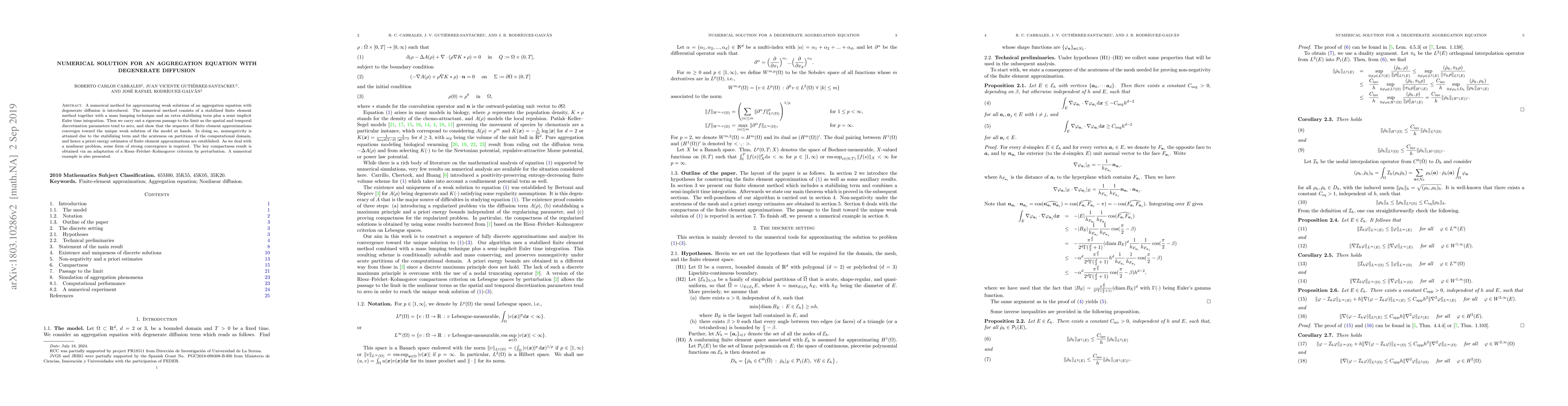 This paper introduces a numerical method for approximating weak solutions of an aggregation equation with degenerate diffusion, combining a stabilized finite element method, mass lumping, and a semi-implicit Euler time integration. The method ensures nonnegativity and establishes a priori energy estimates, with strong convergence achieved via an adapted Riesz-Fréchet-Kolmogorov criterion.