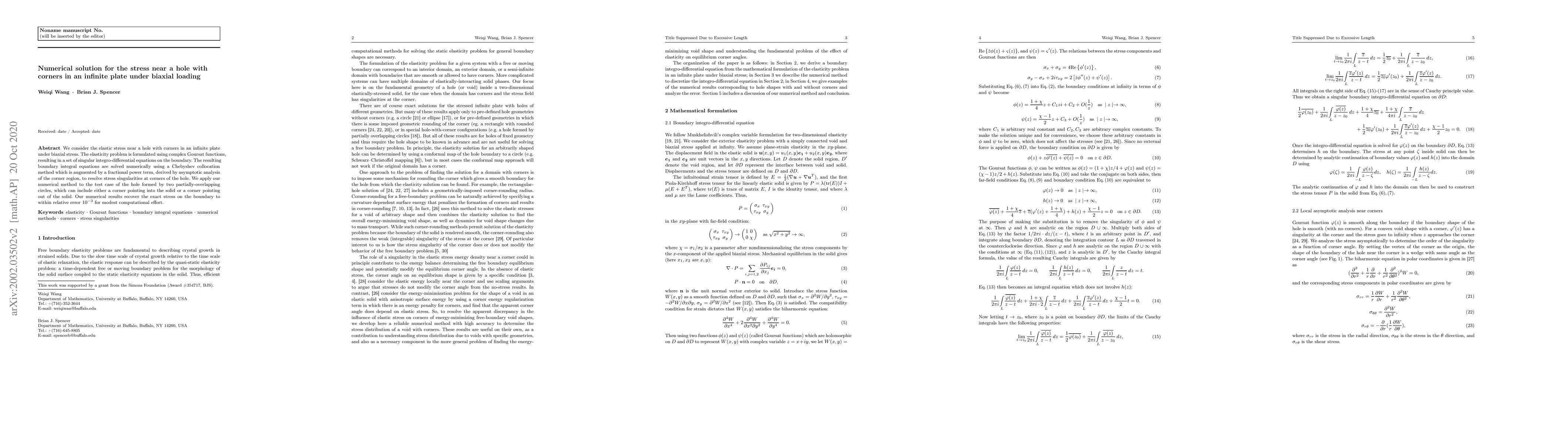 We consider the elastic stress near a hole with corners in an infinite plate under biaxial stress. The elasticity problem is formulated using complex Goursat functions, resulting in a set of singular integro-differential equations on the boundary. The resulting boundary integral equations are solved numerically using a Chebyshev collocation method which is augmented by a fractional power term, derived by asymptotic analysis of the corner region, to resolve stress singularities at corners of the hole. We apply our numerical method to the test case of the hole formed by two partially-overlapping circles, which can include either a corner pointing into the solid or a corner pointing out of the solid. Our numerical results recover the exact stress on the boundary to within relative error $10^{-3}$ for modest computational effort.