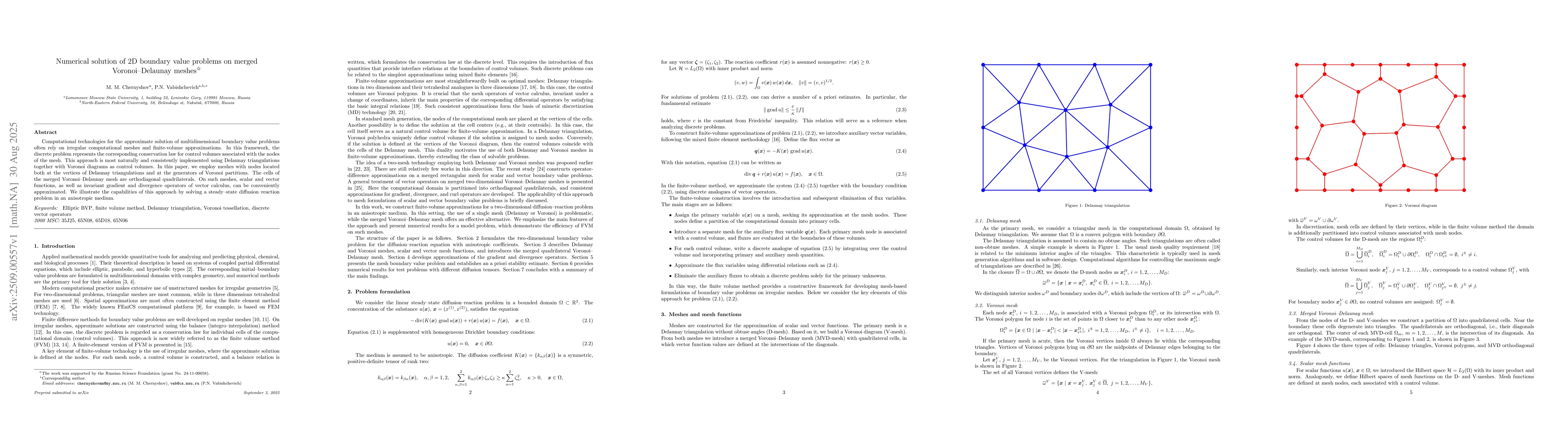 Computational technologies for the approximate solution of multidimensional boundary value problems often rely on irregular computational meshes and finite-volume approximations. In this framework, the discrete problem represents the corresponding conservation law for control volumes associated with the nodes of the mesh. This approach is most naturally and consistently implemented using Delaunay triangulations together with Voronoi diagrams as control volumes. In this paper, we employ meshes with nodes located both at the vertices of Delaunay triangulations and at the generators of Voronoi partitions. The cells of the merged Voronoi-Delaunay mesh are orthodiagonal quadrilaterals. On such meshes, scalar and vector functions, as well as invariant gradient and divergence operators of vector calculus, can be conveniently approximated. We illustrate the capabilities of this approach by solving a steady-state diffusion-reaction problem in an anisotropic medium.
