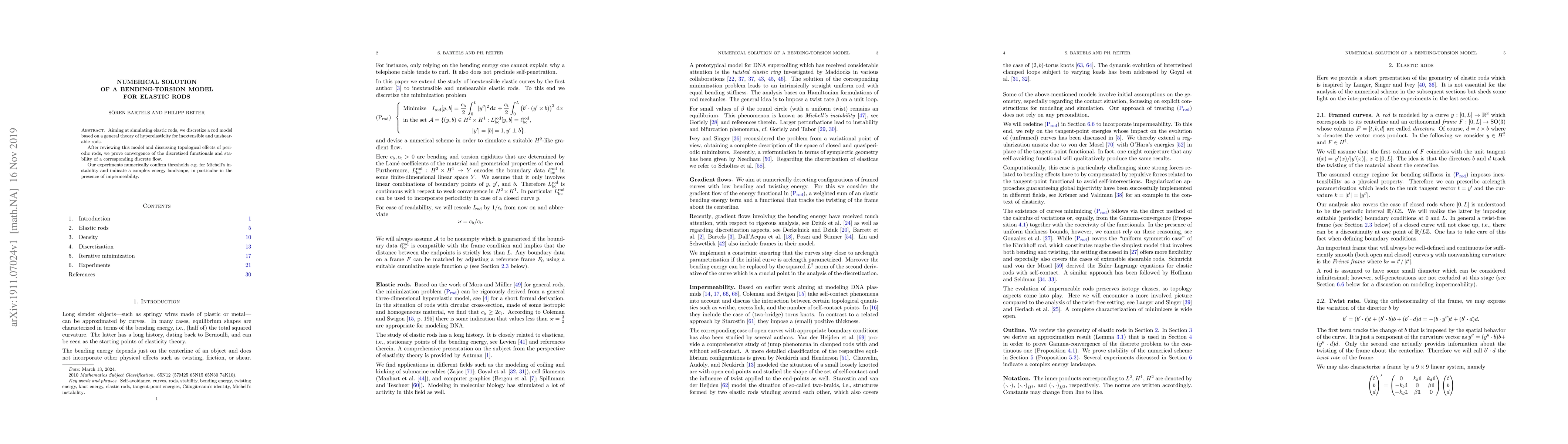 This paper develops a numerical model for simulating elastic rods based on hyperelasticity theory, proving the convergence and stability of the discretized model. Numerical experiments confirm critical thresholds for phenomena like Michell's instability and reveal a complex energy landscape, especially under impermeability conditions.
