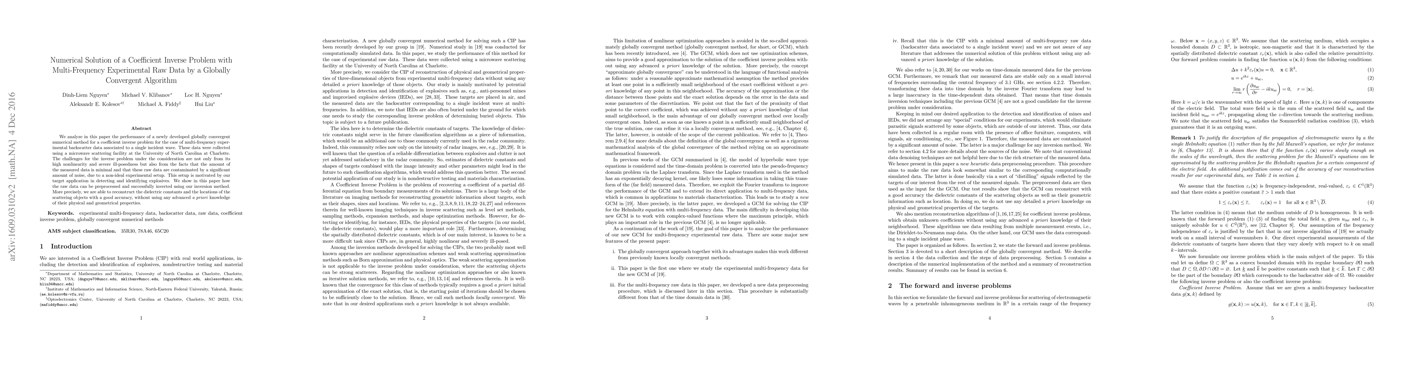 The research presents a globally convergent numerical method for solving a coefficient inverse problem with multi-frequency experimental backscatter data, associated with a single incident wave. The method was tested using data collected from a microwave scattering facility at the University of North Carolina at Charlotte, aiming to detect and identify explosives.