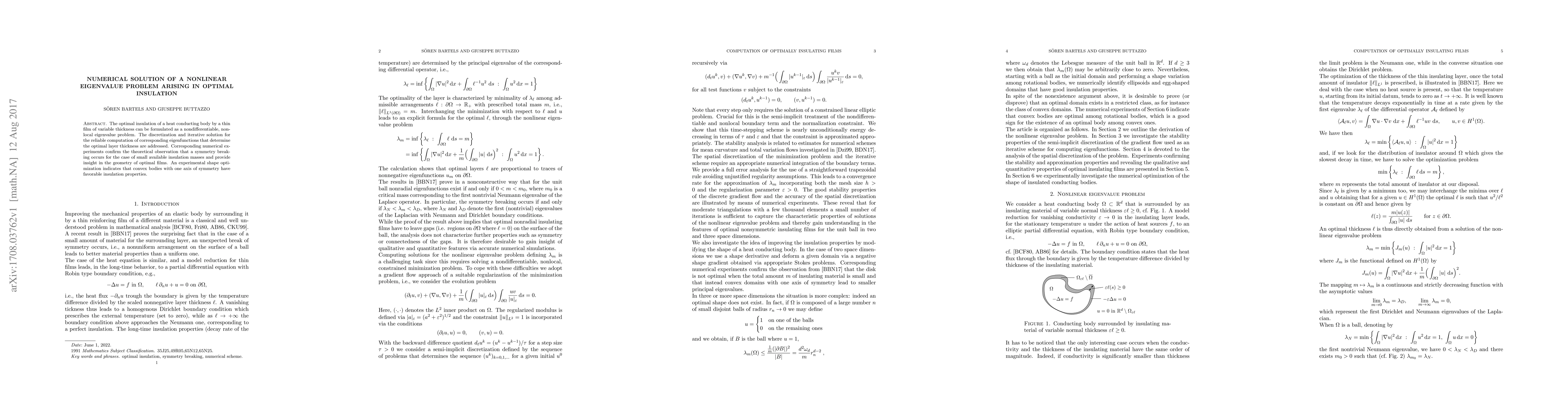 The optimal insulation of a heat conducting body by a thin film of variable thickness can be formulated as a nondifferentiable, nonlocal eigenvalue problem. The discretization and iterative solution for the reliable computation of corresponding eigenfunctions that determine the optimal layer thickness are addressed. Corresponding numerical experiments confirm the theoretical observation that a symmetry breaking occurs for the case of small available insulation masses and provide insight in the geometry of optimal films. An experimental shape optimization indicates that convex bodies with one axis of symmetry have favorable insulation properties.