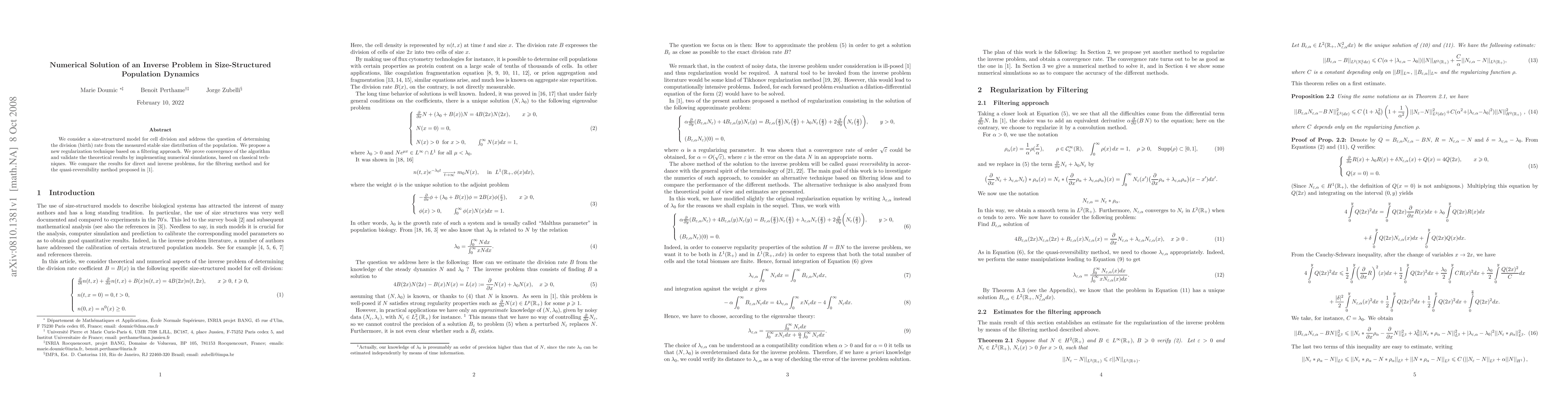 This paper proposes a new regularization technique for solving an inverse problem in size-structured population dynamics, focusing on determining the division rate from the stable size distribution. The authors validate their filtering approach through numerical simulations and compare it with the quasi-reversibility method.