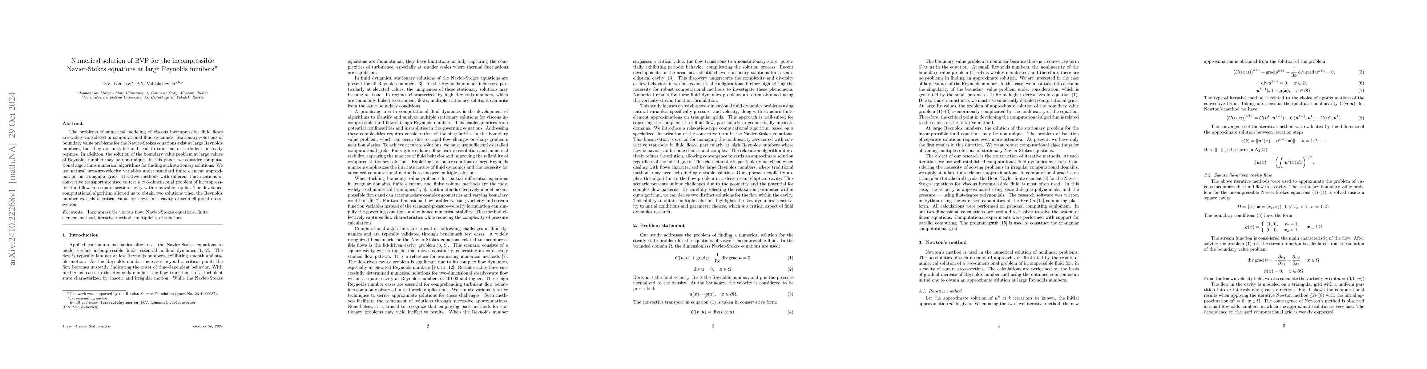 The problems of numerical modeling of viscous incompressible fluid flows are widely considered in computational fluid dynamics. Stationary solutions of boundary value problems for the Navier-Stokes equations exist at large Reynolds numbers, but they are unstable and lead to transient or turbulent unsteady regimes. In addition, the solution of the boundary value problem at large values of Reynolds number may be non-unique. In this paper, we consider computational algorithms numerical algorithms for finding such stationary solutions. We use natural pressure-velocity variables under standard finite element approximation on triangular grids. Iterative methods with different linearizations of convective transport are used to test a two-dimensional problem of incompressible fluid flow in a square-section cavity with a movable top lid. The developed computational algorithm allowed us to obtain two solutions when the Reynolds number exceeds a critical value for flows in a cavity of semi-elliptical cross-section.