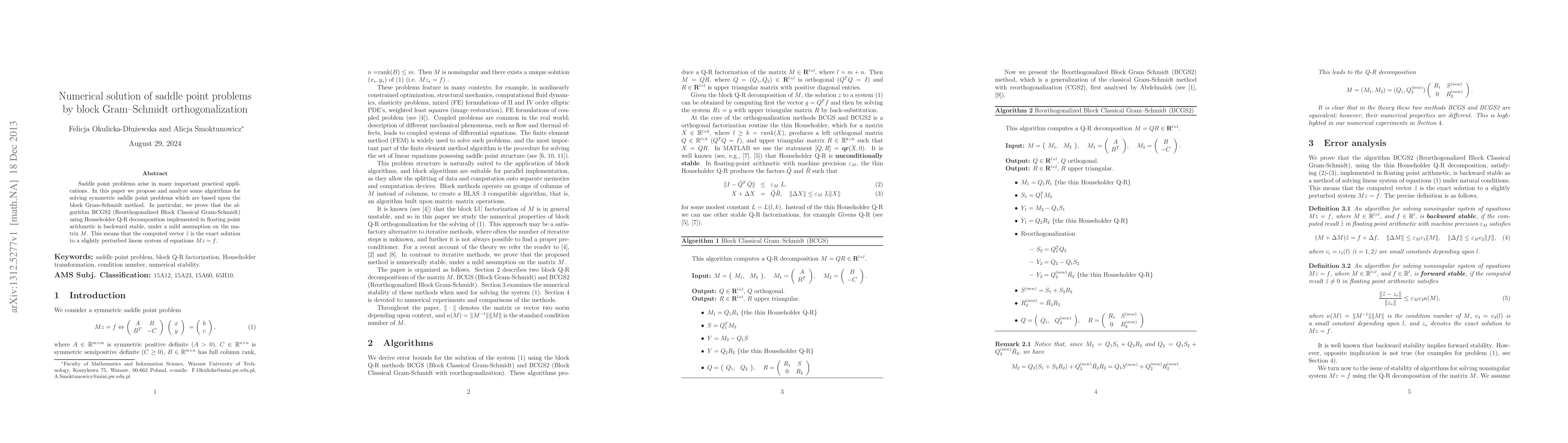 Saddle point problems arise in many important practical applications. In this paper we propose and analyze some algorithms for solving symmetric saddle point problems which are based upon the block Gram-Schmidt method. In particular, we prove that the algorithm BCGS2 (Reorthogonalized Block Classical Gram-Schmidt) using Householder Q-R decomposition implemented in floating point arithmetic is backward stable, under a mild assumption on the matrix $M$. This means that the computed vector $\tilde z$ is the exact solution to a slightly perturbed linear system of equations $Mz = f$.