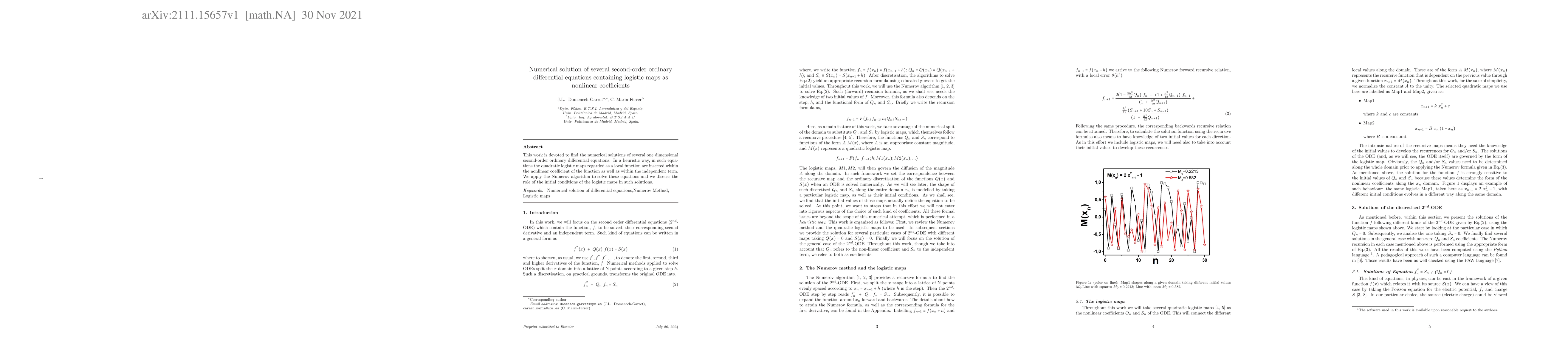 This work is devoted to find the numerical solutions of several one dimensional second-order ordinary differential equations. In a heuristic way, in such equations the quadratic logistic maps regarded as a local function are inserted within the nonlinear coefficient of the function as well as within the independent term. We apply the Numerov algorithm to solve these equations and we discuss the role of the initial conditions of the logistic maps in such solutions.