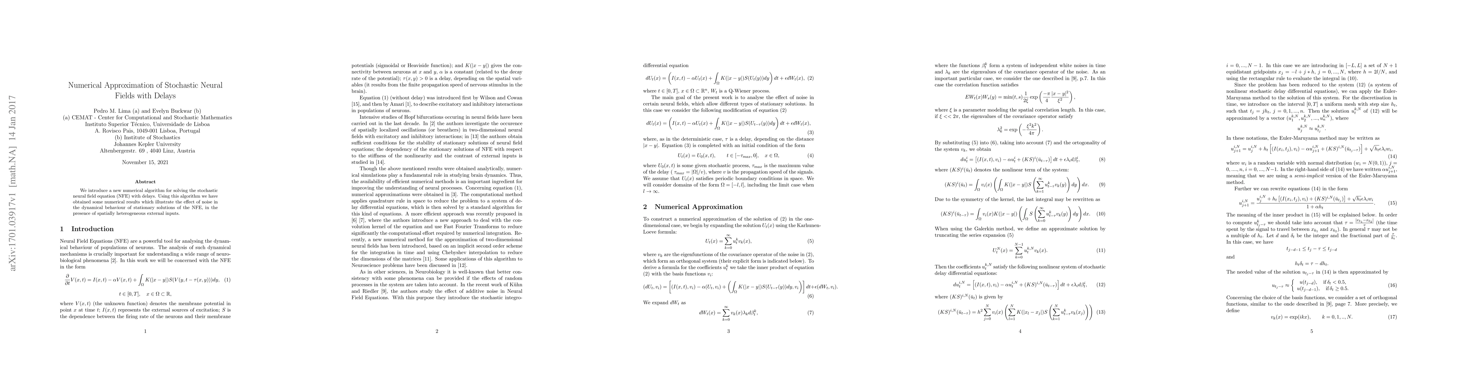 Summary: This paper presents a novel numerical algorithm to solve the stochastic neural field equation with delays, demonstrating the impact of noise on the dynamical behavior of stationary solutions under spatially heterogeneous external inputs.