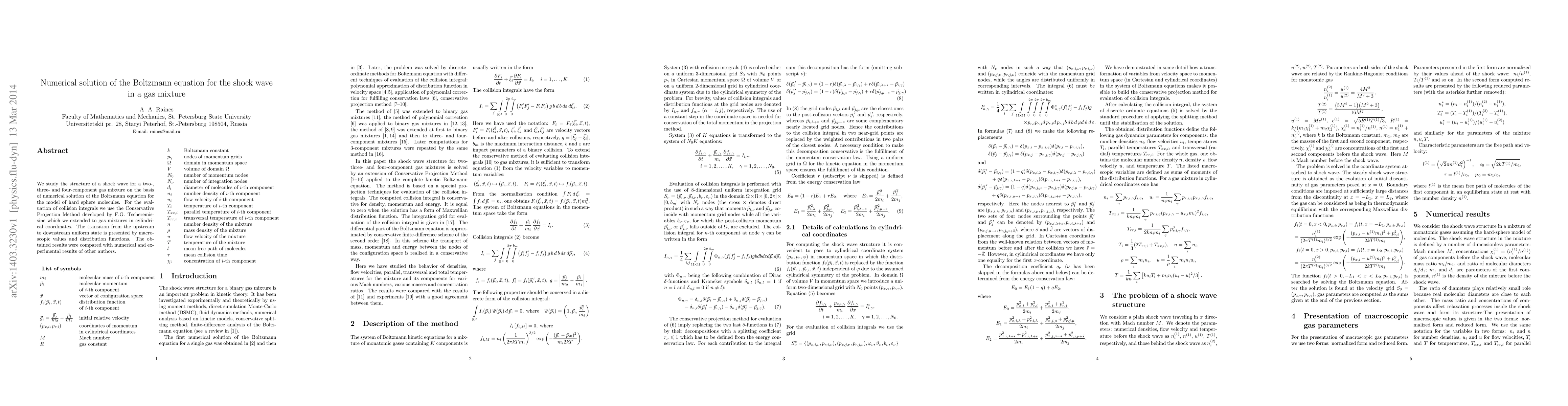 We study the structure of a shock wave for a two-, three- and four-component gas mixture on the basis of numerical solution of the Boltzmann equation for the model of hard sphere molecules. For the evaluation of collision integrals we use the Conservative Projection Method developed by F.G. Tscheremissine which we extended to gas mixtures in cylindrical coordinates. The transition from the upstream to downstream uniform state is presented by macroscopic values and distribution functions. The obtained results were compared with numerical and experimental results of other authors.