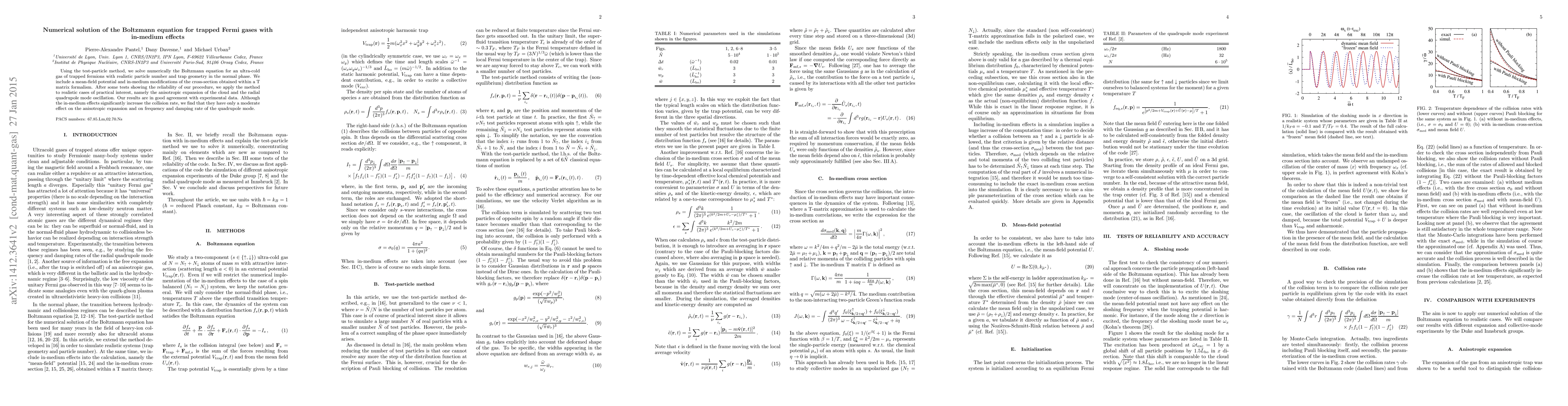 Using the test-particle method, we solve numerically the Boltzmann equation for an ultra-cold gas of trapped fermions with realistic particle number and trap geometry in the normal phase. We include a mean-field potential and in-medium modifications of the cross-section obtained within a T matrix formalism. After some tests showing the reliability of our procedure, we apply the method to realistic cases of practical interest, namely the anisotropic expansion of the cloud and the radial quadrupole mode oscillation. Our results are in good agreement with experimental data. Although the in-medium effects significantly increase the collision rate, we find that they have only a moderate effect on the anisotropic expansion and on frequency and damping rate of the quadrupole mode.