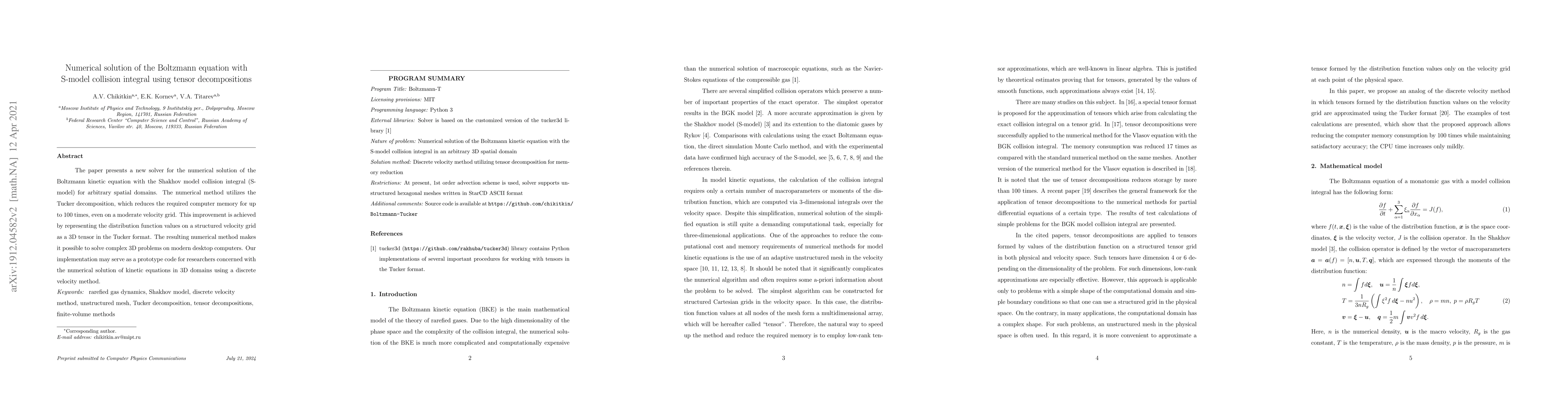 This paper introduces a new solver for the Boltzmann kinetic equation using the Shakhov model collision integral, employing Tensor-Train decomposition to reduce memory usage by up to 30 times. This method enables the solution of complex 3D problems on standard desktop computers.