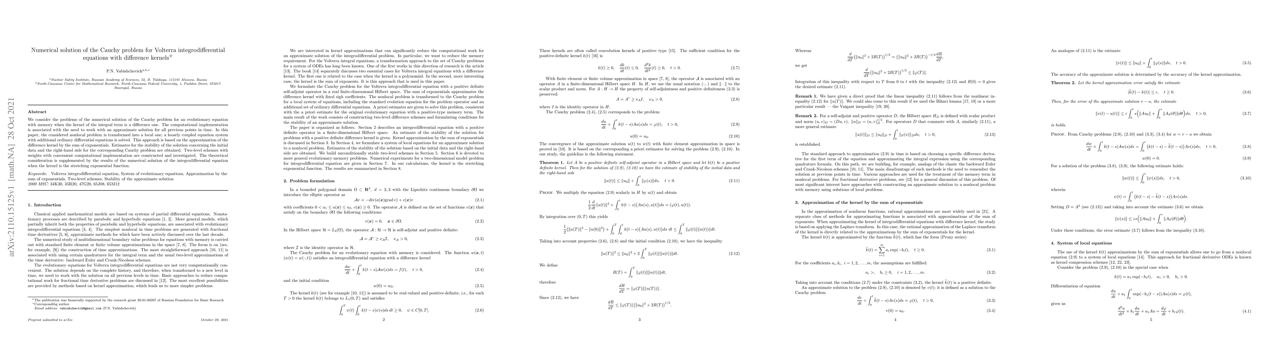 We consider the problems of the numerical solution of the Cauchy problem for an evolutionary equation with memory when the kernel of the integral term is a difference one. The computational implementation is associated with the need to work with an approximate solution for all previous points in time. In this paper, the considered nonlocal problem is transformed into a local one; a loosely coupled equation system with additional ordinary differential equations is solved. This approach is based on the approximation of the difference kernel by the sum of exponentials. Estimates for the stability of the solution concerning the initial data and the right-hand side for the corresponding Cauchy problem are obtained. Two-level schemes with weights with convenient computational implementation are constructed and investigated. The theoretical consideration is supplemented by the results of the numerical solution of the integrodifferential equation when the kernel is the stretching exponential function.