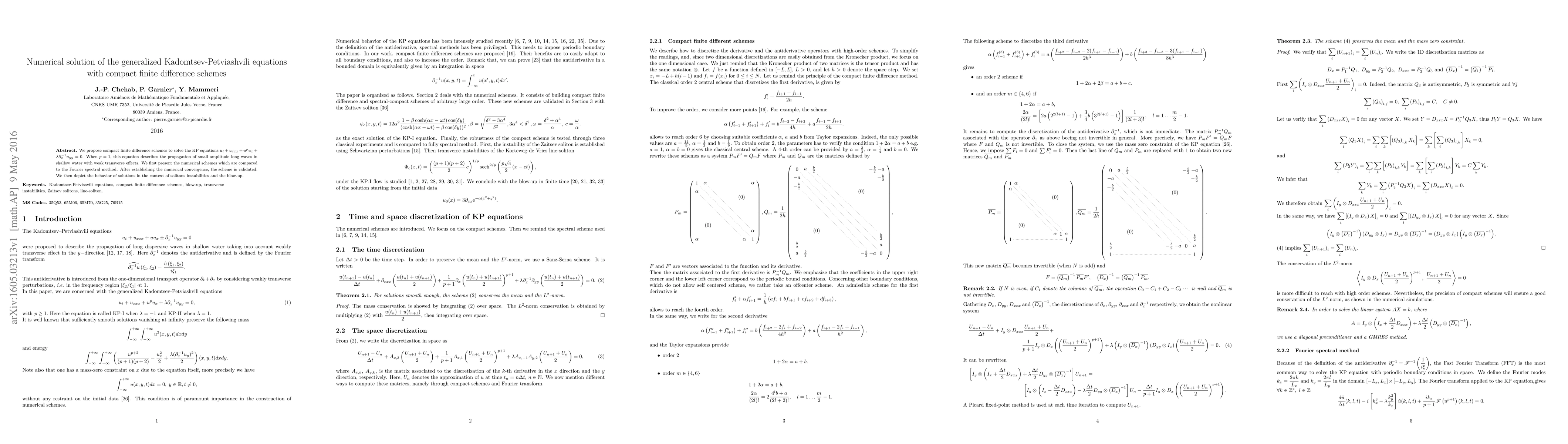We propose compact finite difference schemes to solve the KP equations $u\_t + u\_{xxx} + u^p u\_x + $\lambda$ \partial^{--1}\_x u\_{yy} = 0$. When $p = 1$, this equation describes the propagation of small amplitude long waves in shallow water with weak transverse effects. We first present the numerical schemes which are compared to the Fourier spectral method. After establishing the numerical convergence, the scheme is validated. We then depict the behavior of solutions in the context of solitons instabilities and the blow-up.