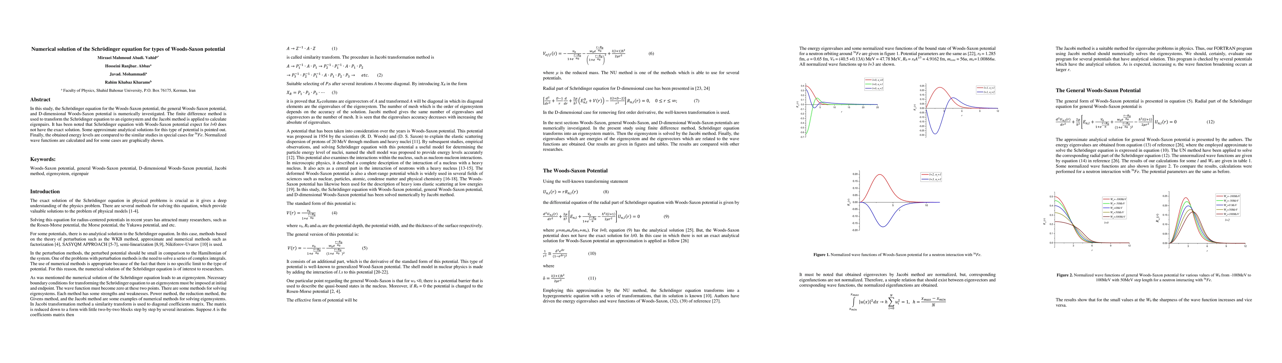 Summary: This paper numerically solves the Schrödinger equation for various types of Woods-Saxon potentials, including the general and D-dimensional forms, to explore their quantum mechanical properties.
