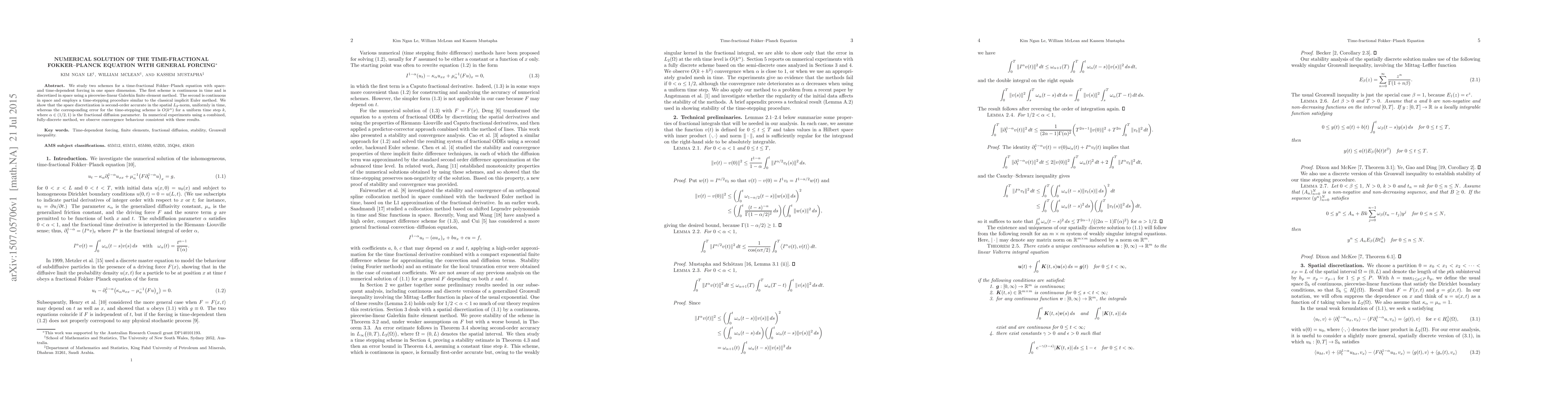 This paper proposes two numerical schemes for solving the time-fractional Fokker-Planck equation with general forcing. The first scheme is second-order accurate in space, while the second is $O(k^\alpha)$ accurate in time, with $\alpha$ dependent on the fractional diffusion parameter. Numerical experiments confirm the theoretical convergence rates.