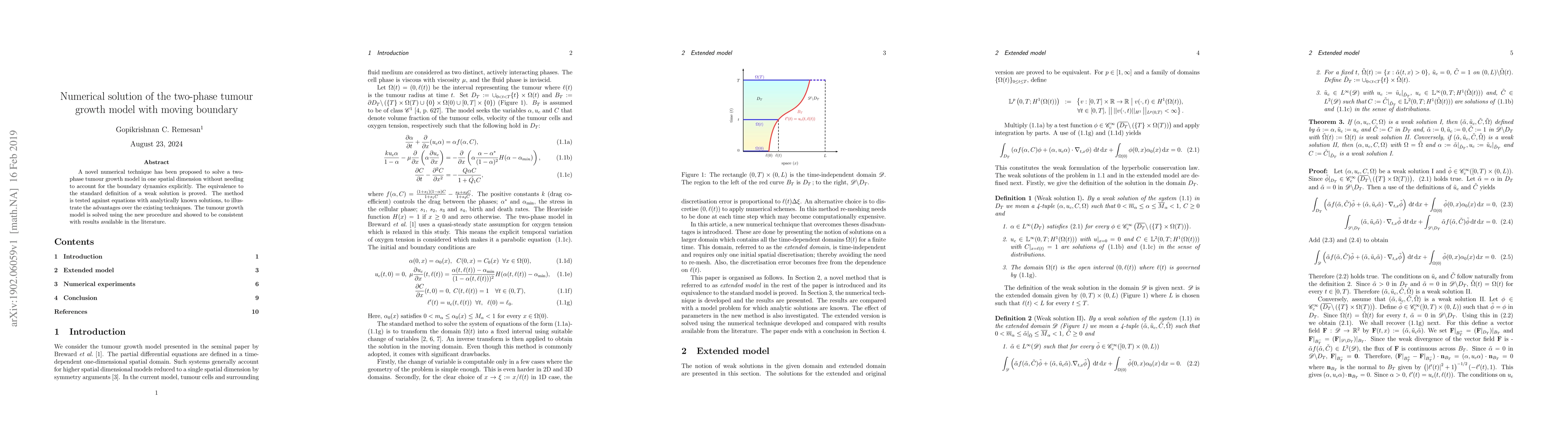 A novel numerical technique solves a two-phase tumour growth model in one dimension without accounting for boundary dynamics explicitly, proving equivalence to the standard definition of a weak solution.