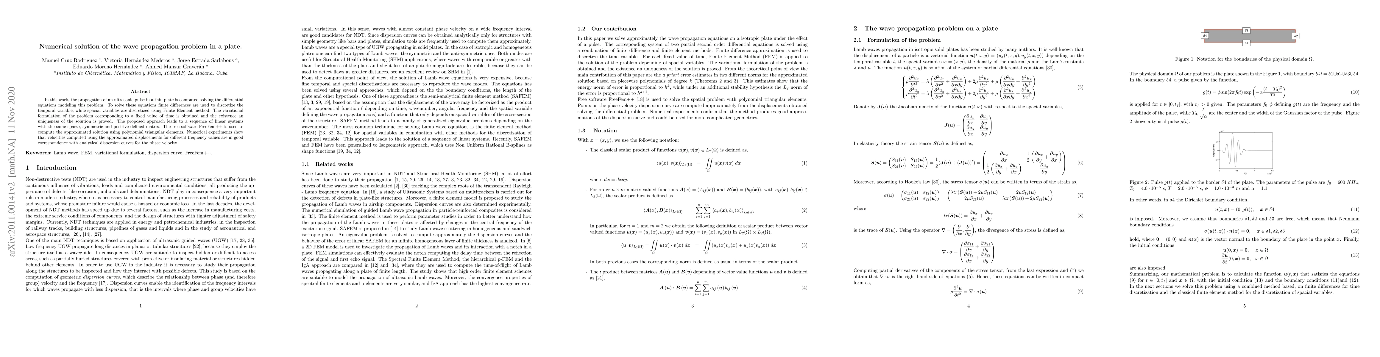 In this work, the propagation of an ultrasonic pulse in a thin plate is computed solving the differential equations modeling this problem. To solve these equations finite differences are used to discretize the temporal variable, while spacial variables are discretized using Finite Element method. The variational formulation of the problem corresponding to a fixed value of time is obtained and the existence an uniqueness of the solution is proved. The proposed approach leads to a sequence of linear systems with the same sparse, symmetric and positive defined matrix. The free software FreeFem++ is used to compute the approximated solution using polynomial triangular elements. Numerical experiments show that velocities computed using the approximated displacements for different frequency values are in good correspondence with analytical dispersion curves for the phase velocity.
