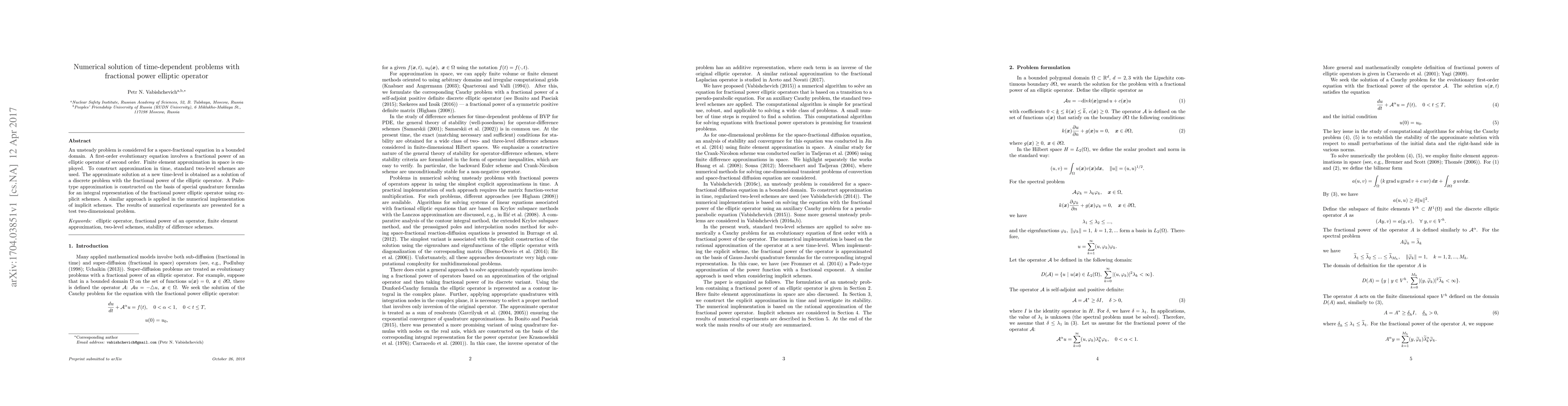 This paper presents a numerical method for solving unsteady problems involving a space-fractional equation with a fractional power of a second-order elliptic operator. It employs finite element methods for spatial discretization and two-level schemes for temporal approximation, utilizing Pade-type approximations for the fractional power operator in both explicit and implicit schemes.