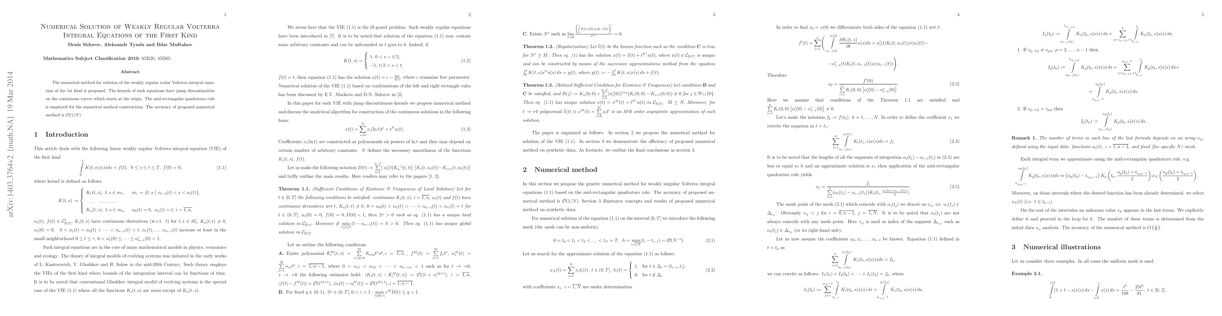 This paper proposes a numerical method using the mid-rectangular quadrature rule to solve weakly regular scalar Volterra integral equations of the first kind, which feature kernels with discontinuities. The method achieves an accuracy of $\mathcal{O}(1/N)$.
