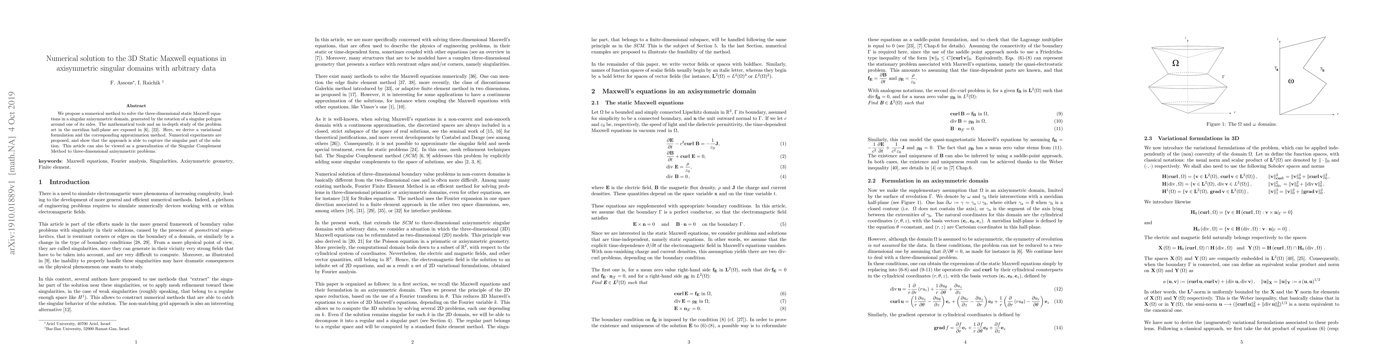 This research paper proposes a numerical method to solve 3D static Maxwell equations in axisymmetric singular domains with arbitrary data, capturing the singular part of the solution using a variational formulation.