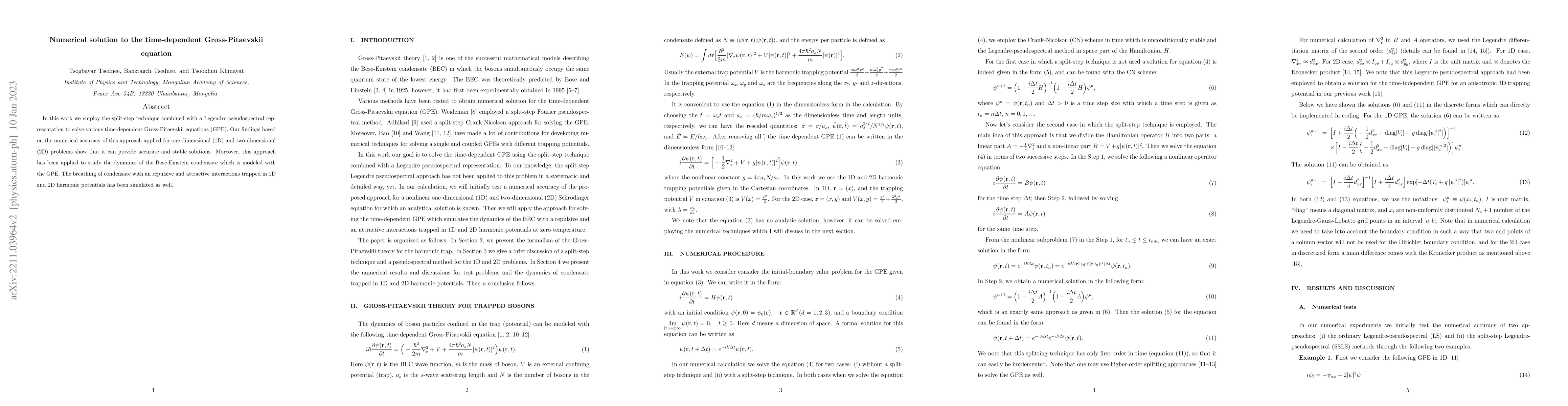 This paper uses the split-step technique with Legendre pseudospectral representation to solve time-dependent Gross-Pitaevskii equations, demonstrating accurate and stable results for 1D and 2D scenarios. The method is applied to model the dynamics of Bose-Einstein condensates, simulating breathing effects under both repulsive and attractive interactions in harmonic potentials.
