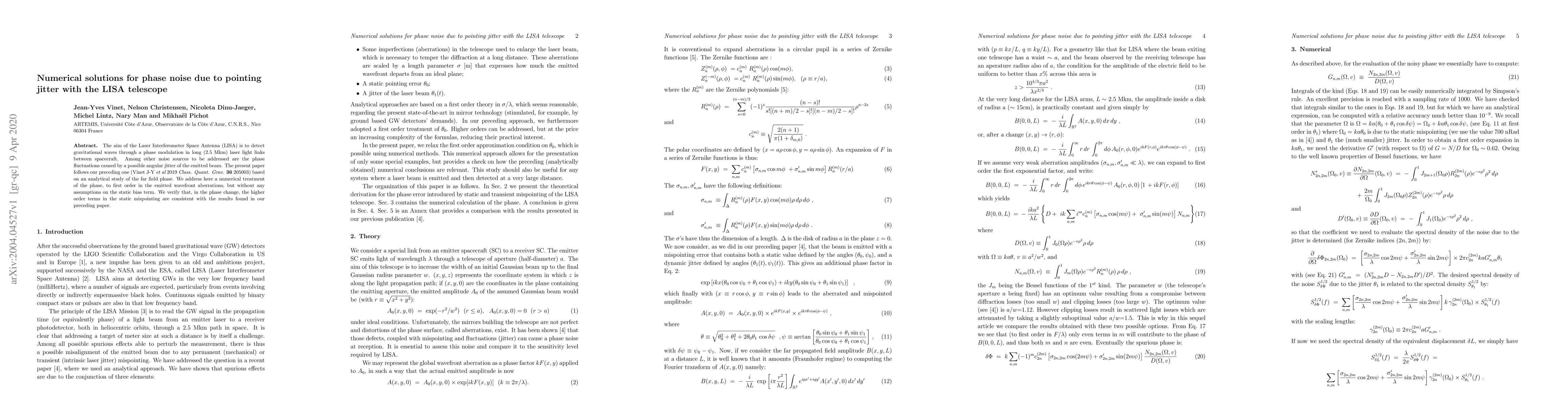 This paper explores phase noise caused by pointing jitter in the LISA telescope, providing a numerical solution to improve its gravitational wave detection capabilities.