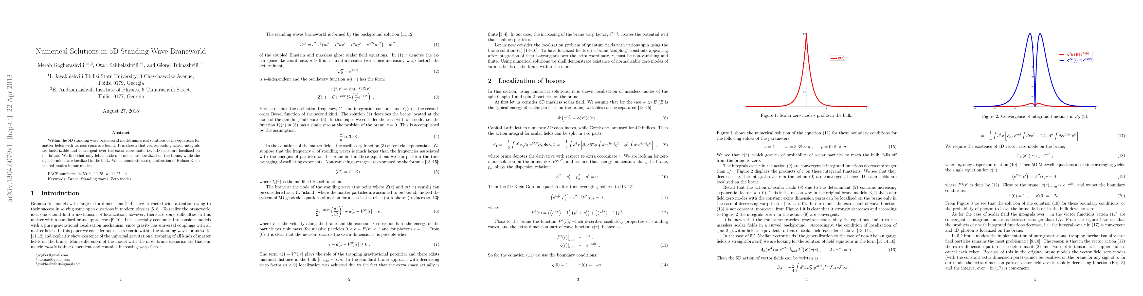 This paper presents numerical solutions for matter fields in a 5D standing wave braneworld model, showing factorizable and convergent action integrals for 4D fields localized on the brane. It finds that only left massless fermions are localized on the brane, while right fermions are in the bulk, and demonstrates quantization of Kaluza-Klein modes.