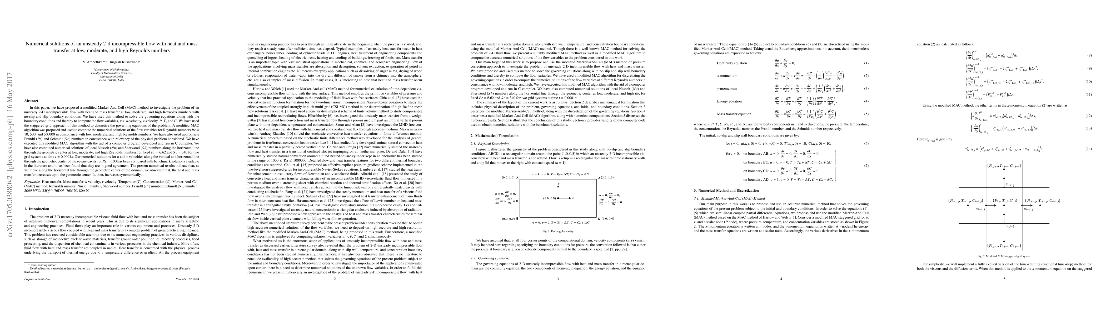 This paper proposes a modified Marker-And-Cell (MAC) method for solving unsteady 2-D incompressible flow with heat and mass transfer across varying Reynolds numbers. Numerical solutions for flow variables and heat/mass transfer coefficients are computed for $Re = 10$, 500, and 50,000, showing symmetrical heat and mass transfer behavior around the geometric center.