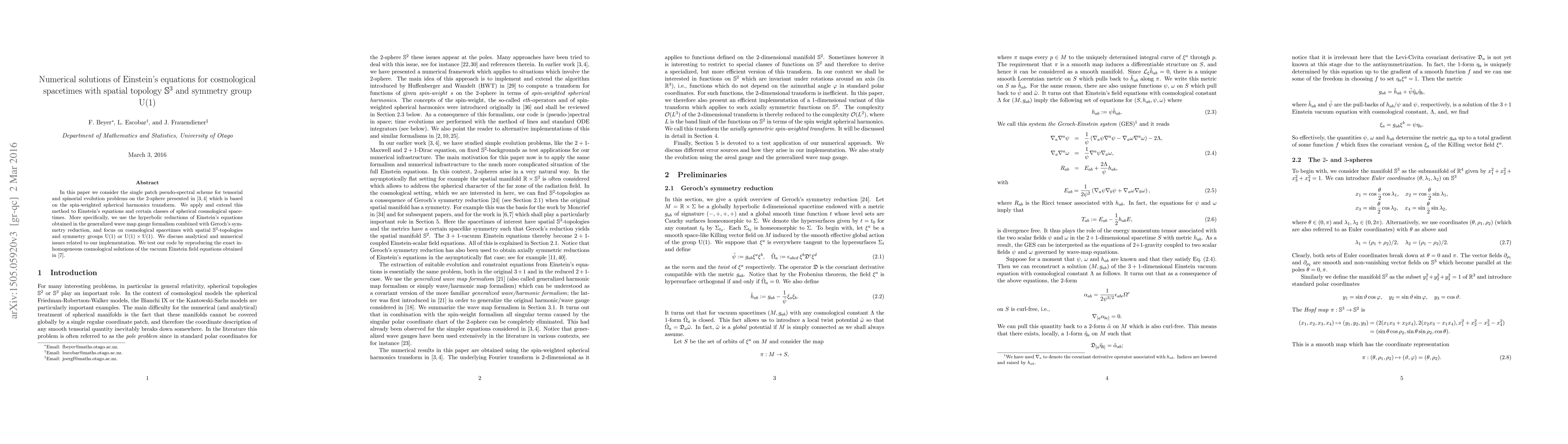 This paper develops a pseudo-spectral scheme for solving Einstein's equations in cosmological spacetimes with S3 spatial topology and U(1) symmetry, utilizing spin-weighted spherical harmonics. The method is tested by reproducing known inhomogeneous vacuum solutions.