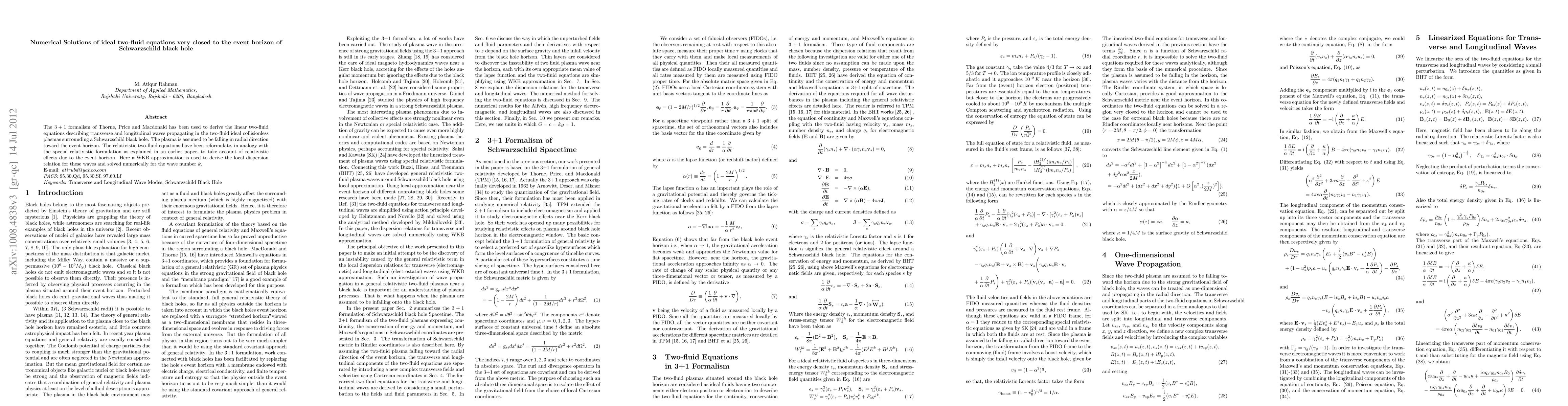 This paper employs the 3+1 formalism to derive linear two-fluid equations for plasma waves near a Schwarzschild black hole's event horizon, reformulating them to account for relativistic effects. Numerical solutions for wave numbers are obtained using a WKB approximation.