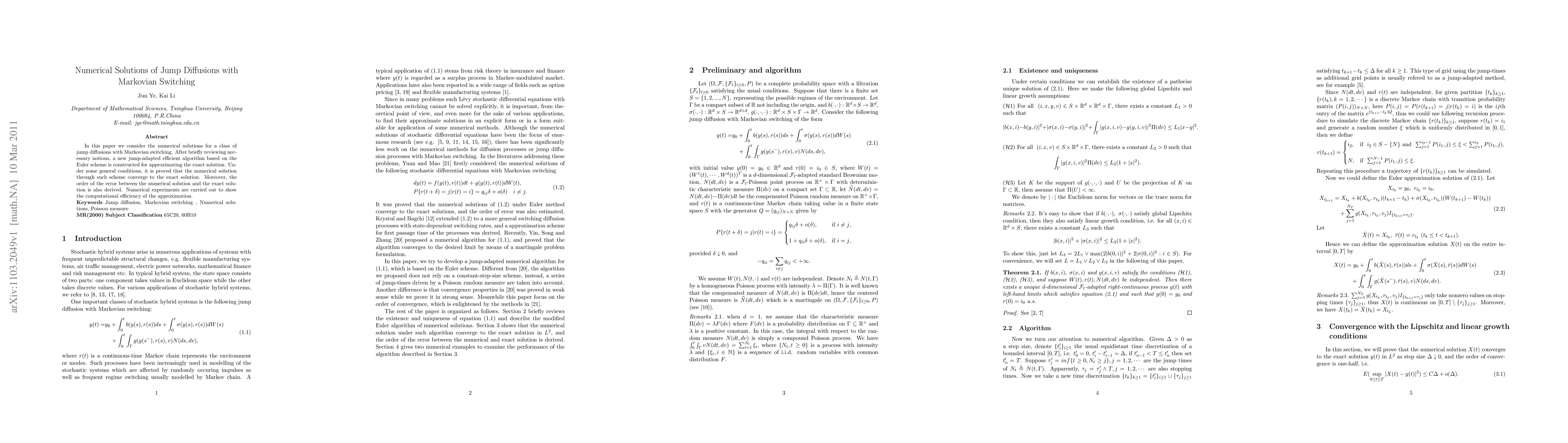 This paper develops a new jump-adapted Euler scheme for numerically solving jump diffusions with Markovian switching, proving its convergence and deriving the error order. Numerical experiments demonstrate the computational efficiency of the proposed method.