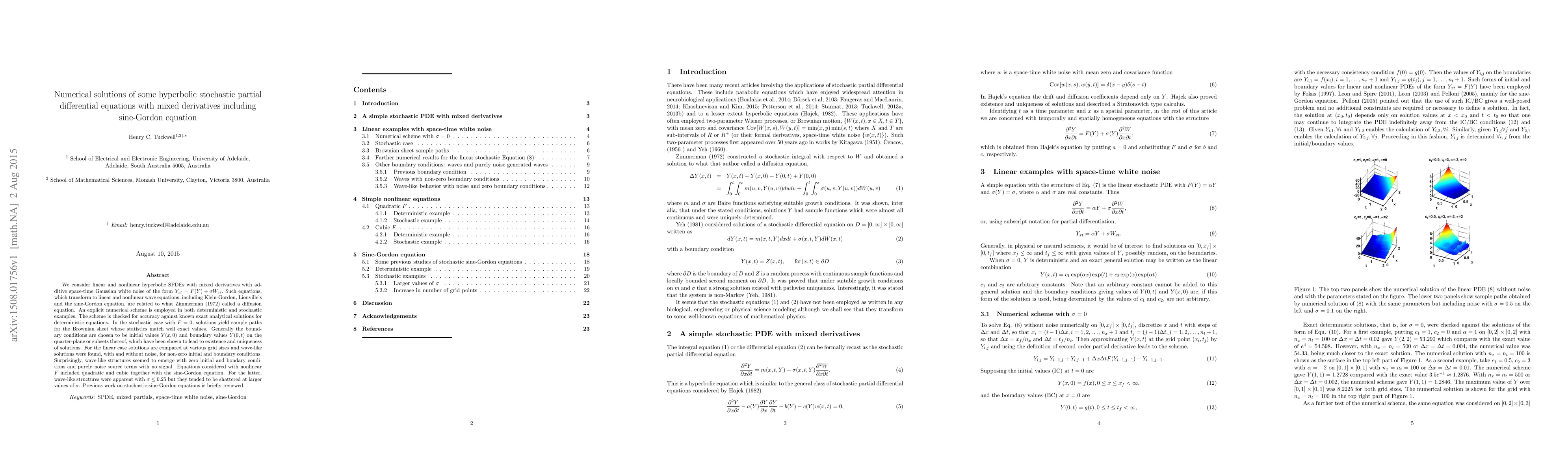 This paper explores numerical solutions for hyperbolic stochastic partial differential equations (SPDEs) with mixed derivatives, including the sine-Gordon equation, using an explicit scheme. The scheme's accuracy is validated against deterministic solutions, and stochastic solutions match Brownian sheet statistics, revealing wave-like structures even with zero initial conditions and noise.